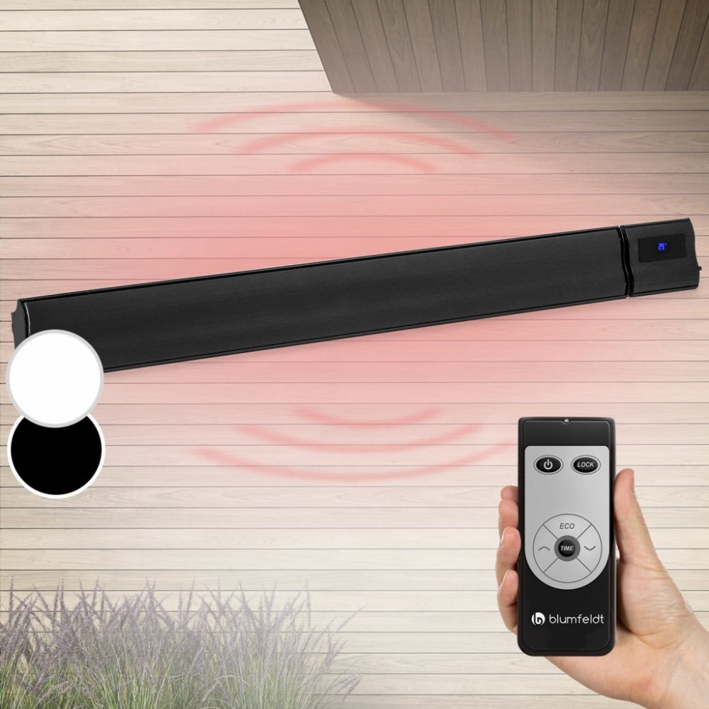 Sálavé teplo v jednoduchém designu: infračervené topné těleso Blumfeldt Cosmic Beam Plus spolehlivě zahřívá posezení na terase nebo na zahradě a díky nenápadnému bílému designu dokonale zapadne do prostředí světlých stěn domů. Lehký tmavý zářič Blumfeldt Cosmic Beam Plus jednoduše namontujete na stěnu nebo strop. Díky tomu Vám nepřekáží v pohybu. Rychle a účinně s výkonem 2400 W předává dlouhovlnné infračervené světlo a noří okolí do příjemného tepla. Integrovaný termostat a teplotní senzor neustále kontrolují venkovní teplotu a umožňují zařízení okamžitě reagovat na teplotní výkyvy. Díky technologii IR Comfort Heat je teplo předáváno cíleně na objekty a osoby, vzduch se zbytečně neohřívá. Dokonce ani studený vítr neovlivní topný výkon a komáři nebudou přitahováni. Zařízení Cosmic Beam Plus využívá dlouhovlnné infračervené záření a neprodukuje oslňující, červené světlo. Pomocí dálkového ovladače jej můžete pohodlně zapnout a vypnout, ale i nastavit na stupeň přesně požadovanou okolní teplotu v rozmezí od 5 do 45 ° C. Můžete také nastavit praktický časovač vypnutí. Infračervený ohřívač Blumfeldt Cosmic Beam Plus Vám umožní bezstarostné večeře a plánování zahradních párty i oslav, aniž jste si dělali starosti s teplotou. Díky extra dlouhému topnému tělesu s délkou 154 cm pořádně ohřeje i celé párty stoly. Stabilní konstrukce z tlakově litého hliníku je odolná vůči povětrnostním vlivům a díky ochranné třídě IP44 je připravena k použití v exteriéru. Pomocí časovače vypnutí je možné zařízení automaticky vypnout v časovém rozmezí od 1 hodiny do 9 hodin. Dodávaný montážní materiál umožňuje nekomplikovanou montáž na stěnu nebo strop. Oslavujte pozdě do noci nebo prožijte romantický večer na terase při víně a svíčkách, dokud se na obloze objeví hvězdy. Díky infračervenému ohřívači Blumfeldt Cosmic Beam Plus Vám bude příjemně teplo až do konce. Všimněte si, prosím, že infračervený ohřívač nesepne, pokud je zvolená teplota nižší než momentální teplota okolí (nemá chladicí funkci).
