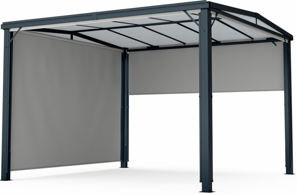 Zažijte příjemné hodiny v zahradě nebo na terase pod ochranou baldachýnu: Pergola Blumfeldt Pantheon Cortina Solid Sky s hliníkovým rámem, pevnou střechou a bočními stěnami vám to umožní!Co může být lepšího než trávit čas venku s rodinou a přáteli? S pergolou Pantheon Cortina Solid Sky budete vždy chráněni před deštěm a horké letní dny můžete trávit v chladivém stínu. Je to díky stabilní ploché střeše z polykarbonátu (PC) a lehkému hliníkovému rámu s práškovým nástřikem. Vysokou stabilitu celé konstrukce zajišťují také šrouby z nerezové oceli odolné proti povětrnostním vlivům. Pergola Blumfeldt Pantheon Cortina Solid Sky lze snadno připevnit k vhodnému podkladu pomocí kolíků nebo bezpečně přišroubovat k terase. Pergola poskytuje bezpečnou ochranu před deštěm a sluncem, a tím zlepšuje posezení na zahradě nebo na terase. Každá boční stěna je vybavena stahovací polyesterovou roletou, která na přání poskytuje soukromí a individuální ochranu proti větru.Vysoce kvalitní, všestranná a robustní: Pergola Blumfeldt Pantheon Cortina Solid Sky poskytuje chvíle odpočinku na zahradě nebo na terase se spolehlivou ochranou proti dešti a slunci a její boční rolety poskytují soukromí a ochranu před větrem.