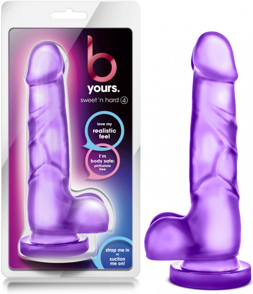 Fialové transparentní dildo je věrně vypracovaný penis s varlaty a žilnatým tělem. Rovný tvar a obnažený žalud přímo vyzývají k nezbedným hrátkám. Dildo je vybaveno silnou přísavkou, kterou můžete přichytit na jakýkoliv hladký povrch a užít si tak kdekoliv, třeba i ve vaně či sprše. Spolu s dildem používejte lubrikační gel na vodní, nebo silikonové bázi. Dildo Blush B YOURS SWEET N HARD 4 se snadn...