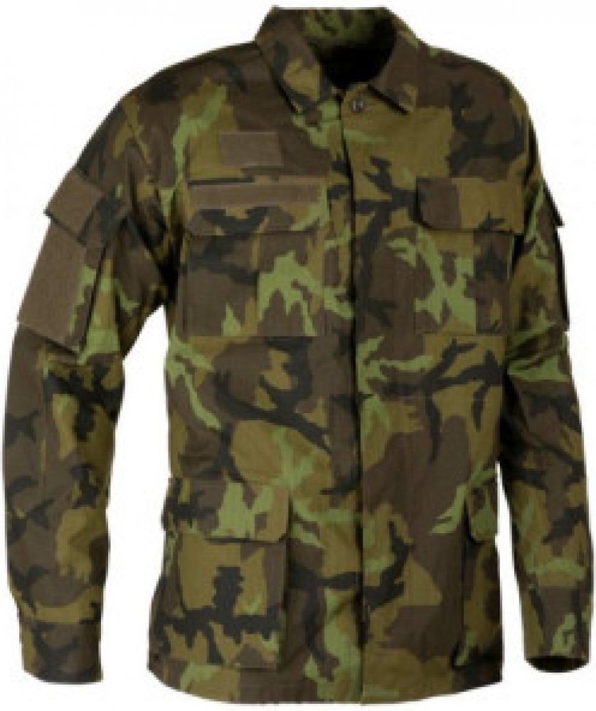 Originální maskáčová blůza vz. 95 letní značky Koutný Blůza má zapínání na knoflíky. Náprsní kapsy jsou poloměchové, jsou kryté patkami a zapínají se na knoflíky. Nad pravou kapsou a na patce jsou Velcro panely na jmenovku a hodnost. Zevnitř jsou také náprsní kapsy, vlevo je na vnitřní kapse ještě další kapsa na dozimetr. Spodní kapsy na předním díle jsou měchové, patka se zapíná na knoflíky. Ve spodní části zadního dílu jsou 2 měchové kapsy, patky se zapínají na knoflíky. Rukávy jsou dvoudílné, zakončené manžetou. Na horní části rukávů jsou dvouvrstvé poloměchové kapsy. Spodní kapsa s patkou (zapínání na knoflíky), horní kapsa je stejně velká jako spodní a má svislé zapínání na zip. Na levém rukávu je Velcro panel ve tvaru domovenky. Na kapsách je Velcro panel pro umístění znaků bojové identifikace. Na patce levé rukávové kapsy je vlajka ČR. V podpaží jsou větrací otvory. Na spodním okraji je šňůrka na stahování. Vlastnosti originální maskáčové blůzy vz. 95 letní od značky Koutný Materiál: 50% polyester, 50% bavlna, Rip-stop 8 vnějších kapes 3 vnitřní kapsy Větrací otvory v podpaží Velcro panely Stahování blůzy na šňůrku Velikost: Výška postavy/Obvod hrudníku