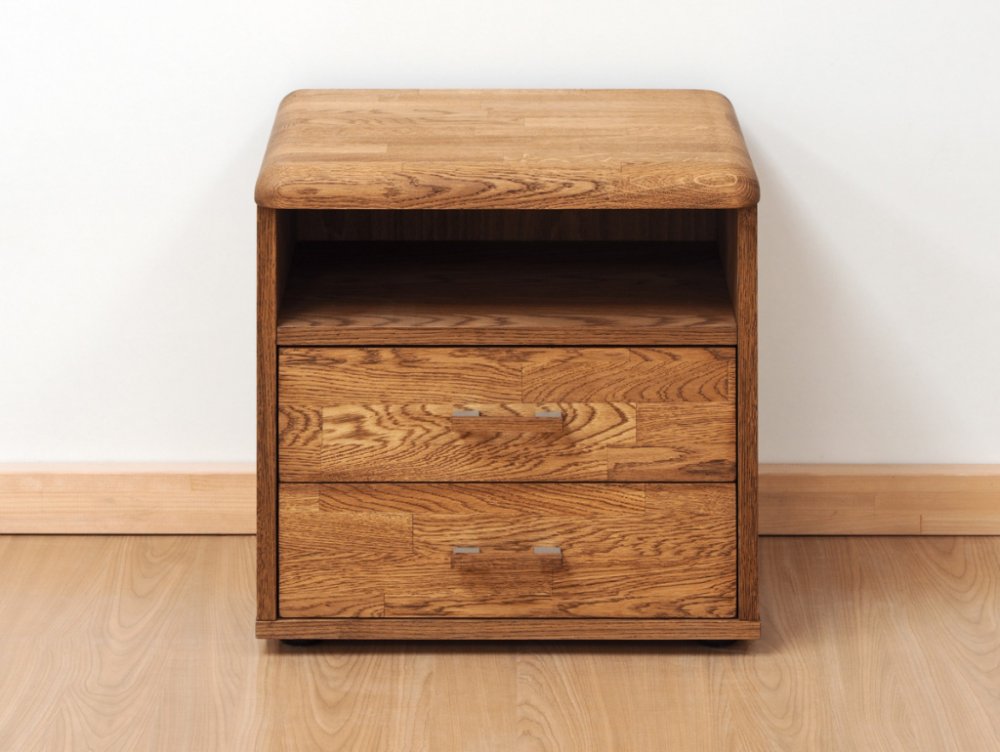 Noční stolek DVOUZÁSUVKOVÝ ADRIANA - z bukového masivu Kvalitní noční stolek neodmyslitelne patří ke každé posteli. Ložnicový nábytek BMB vám nabízí vysokou kvalitu použitých materiálů a jedinečný vzhled masivního bukového dřeva. Materiál Dvouzásuvkový noční stolek ADRIANA je designově laděný k postelím Adriana a Viola. Je vyroben z kvalitního bukového masivu v kombinaci dýhou a překližkou. Horní a přední desky jsou vyrobeny z masivu. Boky, dna a mezistěny z přírodní dýhy. Obvody zásuvek a záda nočního stolku tvoří buková překližka. Zásuvky jsou opatřeny skrytými výsuvy s tichým chodem a tlumeným zavíráním. Bukový masiv nabízíme ve dvou designech: Buk jádrový cink - jedná se o cenově nejdostupnější typ masivního dřeva. Středová část buku při růstu často ztmavne a vytvoří se na ní výrazné skvrny. Jednotlivé lamely pak bývají odlišně zbarvené. Pro sjednocení odstínu je buk jádrový vhodný k moření. Pevnost zůstává stejná jako u buku průběžného. Buk průběžný - skvělá volba pro ty, kdo upřednostňují luxusní a vzhledově "čistý" nábytek, nenajdete na něm větší barevné rozdíly. Při výrobě se jednotlivé vlysy nenastavují, přirozená kresba dřeva tak zůstane zachována. Materiál je velmi pevný a odolný. Používají se jen ta nejkvalitnější prkna bez suků. Výběr moření Ložnicový nábytek včetně nočních stolků vám nabízíme ve stejných odstínech moření jako kvalitní masivní postele BMB, aby vám všechen nábytek hezky ladil. Provedení a rozměry Noční stolek DVOUZÁSUVKOVÝ ADRIANA: š 48,6 cm x v 50 cm x h 38 cm Pozn.: Fotografie výrobku jsou pouze ilustrační, nemusí přesně odpovídat vybrané variantě výrobku, zejména pak zvolené šířce a dekoru.