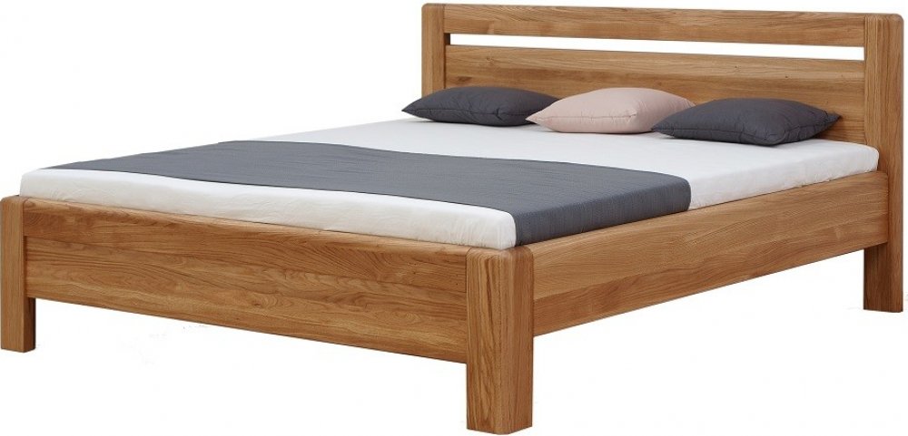Elegance oblých tvarů. Moderní postel s členitým čelem v sobě spojuje praktické využití s dokonale propracovanými liniemi. Její masivní vzhled je určen zejména do prostornějších ložnic. Průřezy v čele postele vytváří rovné linie, které se důmyslně doplňují s jemně zaoblenými hranami po celé konstrukci postele. Vysoce kvalitní postel české výroby zajišťuje pohodlné a zdravé ležení. Postel má zvýšenou lehací plochu, kterou si můžete individuálně nastavit podle svých představ nebo s ohledem na výšku vámi vybrané matrace. Vysoká lehací plocha umožňuje pohodlnější vstávání a uléhání do postele, což ocení všichni uživatelé bez rozdílu věku.Standardně se nabízí v těchto rozměrech:šířka lehací plochy 90, 120, 140, 160, 180 nebo 200 cmdélka lehací plochy 200, 210 nebo 220 cmMateriál lze zvolit:přírodní masivní buk jádrovýpřírodní masivní buk průběžnýpřírodní masivní dub cinkpřírodní masivní dub průběžnýProdloužená záruka 25 let na postel z masivního dřeva po registraci na stránce prodloužené záruky.Postel je dodávána bez matrací, na naši nabídku matrací se můžete podívat zde.Další informace a fotogalerie k výrobku na webu výrobce BMB.Postele z masivu mají konstrukční díly (nohy) tloušťky vždy minimálně 40 mm, postranice 40 mm a výplně zadního a předního čela 20 mm. Každá postel vyrobená z masivu je jedinečná. Kresba dřeva je u každého kusu dřeva jiná a originální, proto nelze vyrobit dva totožné výrobky. Postel může být vyrobena z jádrového buku, průběžného buku, dubu cink nebo dubu průběžného.Bukové dřevo – záruka kvality a dlouhé životnosti, cenově dostupnější, dřevo má výraznou a harmonickou kresbu, díky tomu působí velice přirozeně a atraktivně zejména v mořených odstínech, které je možno vybírat dle naší nabídky. Pro povrchovou úpravou jsou použity ekologické vodouředitelné laky.Buk jádrový (parketový vzor) – mohou být barevné rozdíly u lamel, které jsou způsobené obsahem tmavého jádrového dřeva nebo tmavými skvrnami jádra, doporučujeme hlavně pod moření, které velké barevné rozdíly mezi jednotlivými lamelami úplně eliminuje.Buk průběžný – lamely jsou dlouhé po celé části dílů, barevné sjednocení lépe navozuje atmosféru celomasivu, vhodné jako přírodní provedení.Dubové dřevo – záruka kvality a dlouhé životnosti, dřevo má vysokou tvrdost a pevnost. Pro povrchovou úpravou jsou použity kvalitní přírodní oleje různých odstínů – dle nabídky.Dub cink (parketový vzor) – u lamel dochází k barevně menším rozdílům než u buku jádrového, vhodné i přírodní provedení postele. Dub cink se od dubu průběžného liší výraznější kresbou a zbarvením.Dub průběžný – lamely jsou dlouhé po celé délce dílů, barevné rozdíly jsou minimální, nejreálněji navozuje vzhled celomasivu, jedná se o nejluxusnější provedení.Vnější rozměry posteleMasivVnější šířka (lehací plocha šířky 90 cm)1042 mmVnější šířka (lehací plocha šířky 120 cm)1342 mmVnější šířka (lehací plocha šířky 140 cm)1542 mmVnější šířka (lehací plocha šířky 160 cm)1742 mmVnější šířka (lehací plocha šířky 180 cm)1942 mmVnější šířka (lehací plocha šířky 200 cm)2142 mmVnější délka (lehací plocha délky 200 cm)2080 mmVnější délka (lehací plocha délky 210 cm)2180Vnější délka (lehací plocha délky 220 cm)2280Výška zadního čela (u hlavy)1050 mmVýška předního čela (u nohou)500 mmVzdálenost horní hrany postr.od podlahy500 mmVýška kování pro uložení roštů (od podlahy)305 / 329 / 353 / 377 mm