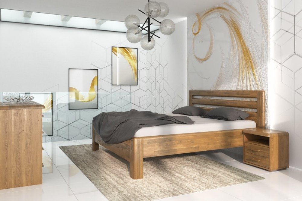 Standardní provedení: buk nebo dub masiv cink, dokončení lak přírodní, rozměr postele 180 x 200 cm, výška postranice 50 cm, matrace a rošty nejsou součástí postele