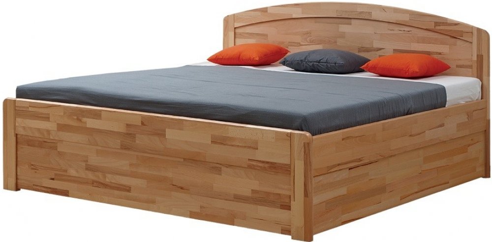 Postel s romantickým obloukovým čelem. Plné čelo působí masivním dojmem.Nabízí se ve dvou základních variantách, a to:varianta s výklopným roštem a pneumatickými písty, v rozměrech šířka 180 nebo 160 cm, délka 200 cm.varianta se střednicí, bez roštů a pístů, v rozměrech šířka 90, 120, 140, 160, 180 nebo 200 cm, délka 200, 210 nebo 220 cm.U obou variant postele lze zvolit designově odlišné provedení rohů, a to rovné nebo oblé.Materiál lze zvolit:imitace masivního dřeva - výběr až z 16 dekorůpřírodní masivní buk jádrový - výběr až z 13 barevných odstínůpřírodní masivní dub cink - výběr z 5 povrchových úpravProdloužená záruka 25 let na postel z masivního dřeva a 10 let na postel z imitace masivního dřeva po registraci na stránce BMBPostel je dodávána bez matracíPostele imitace dřeva jsou vyrobeny z vysoce kvalitních lamino desek firmy Egger a Kronospan, které splňují západoevropské standardy kvality a designu. Hlavním důvodem pro oblíbenost těchto postelí je, že nabízejí širokou škálu barev, které lze snadno kombinovat s dalším nábytkem v ložnici. Výhodou je nižší ceníková cena. Konstrukční díly jsou vyráběny z materiálu tloušťky 32 mm, postranice mají 32 mm, výplně zadního a předního čela mají 16 mm. Provedení postele může být s rovnými rohy, které je levnější na výrobu nebo s oblými rohy, které se ručně frézují a dokonaleji navozují atmosféru masivního dřeva.Postele z masivu mají konstrukční díly (nohy) tloušťky vždy minimálně 40 mm, postranice 30 mm a výplně zadního a předního čela 20 mm. Každá postel vyrobená z masivu je jedinečná. Kresba dřeva je u každého kusu dřeva jiná a originální, proto nelze vyrobit dva totožné výrobky. Postel může být vyrobena z jádrového buku, průběžného buku, dubu cink nebo dubu průběžného. Provedení postele může být s rovnými rohy, které je levnější na výrobu nebo s oblými rohy, které se ručně frézují a dokonaleji navozují atmosféru masivního dřeva.Vnější rozměry posteleImitace dřevaMasivVnější šířka (lehací plocha šířky 160 cm)1684 mm1684 mmVnější šířka (lehací plocha šířky 180 cm)1884 mm1884 mmVnější délka (lehací plocha délky 200 cm)2064 mm2080 mmVýška zadního čela (u hlavy)1006 mm1006 mmVýška předního čela (u nohou) – rovné / oblé provedení480 / 495 mm480 / 495 mmVzdálenost horní hrany postranice od podlahy475 mm470 mmVýška horní plochy roštu od podlahy - verze s roštem415 mm410 mmVýška kování pro uložení roštů (od podlahy) - verze bez roštu332 / 356 / 380 mm327 / 351 / 375 mm