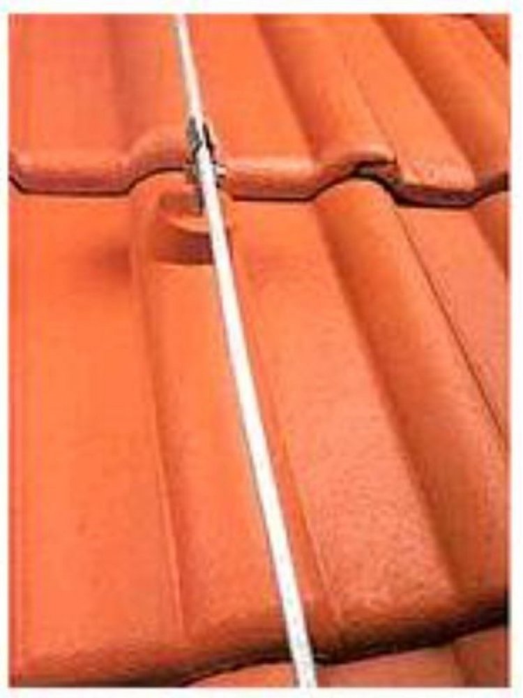 Hromosvodová taška je základním prvkem pro instalaci systému ochrany před následky úderu blesku. Hromosvodová taška je základním prvkem pro instalaci systému ochrany před následky úderu blesku. OCHRANA PŘED NÁSLEDKY ÚDERU BLESKU Na tělo základní tašky je v betonovém nálitku o výšce 30 mm vsazena podpěra vedení hromosvodu. Ta je vyrobena z nerezavějící oceli a konstrukčně řešena tak, že je k ní vodič připevněn právě ve vzdálenosti 70 mm od povrchu krytiny. Doporučený utahovací moment 20 Nm. Hromosvodové tašky se připevňují ke střešní lati dvěma vruty. Svým tvarem odpovídá tvaru příslušného modelu betonové krytiny.