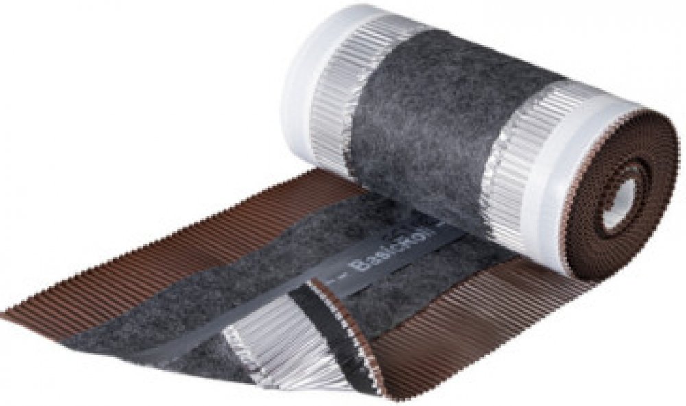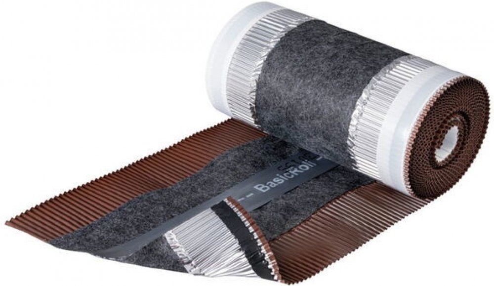 Větrací pás Basicroll je odborným řešením odvětrání všech střech s minimálním sklonem 16°.VlastnostiBasicroll tvoří netkaná textilie s umělohmotným hřebíkovým pásemPo obou stranách na netkanou textilii navazují plisované barevně upravené hliníkové okraje s podélnou roztažností až 30 %Na spodní straně hliníkových okrajů je průběžný butylový lepicí pásek, který umožňují snadné a trvalé vytvarování tohoto větracího pásu jak na profilované, tak i rovné modely střešních tašekPřispívá k účinnému odvětrání v oblasti hřebene i nároží snižuje riziko průniku větrem hnaného deště a polétavého sněhu pod taškyVýhodyUniverzální prvek pro více modelůRychlá a jednoduchá montážTechnické parametryŠířka pásu: 295 mmPrůřez odvětrání: 100 cm²/mMinimální sklon střechy: 16°Teplota pro zpracování: +5°C až +40°CBarva: tmavohnědáBalení: 1 role/5 m