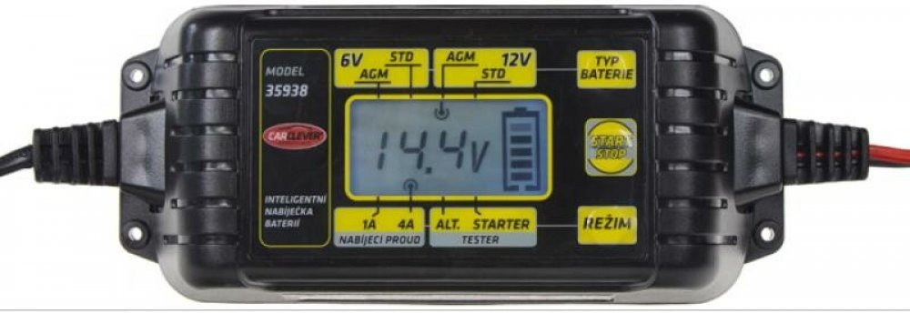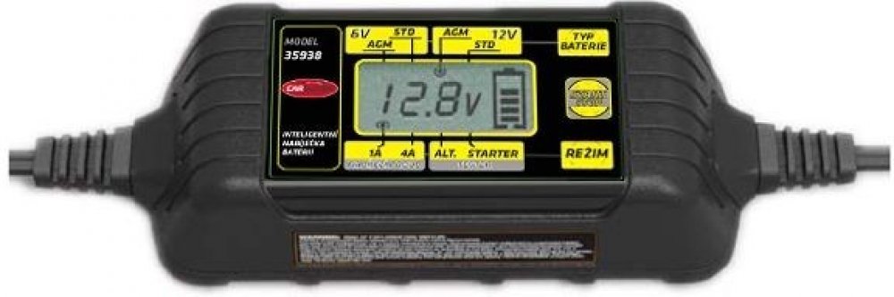 Inteligentní miniaturní nabíječka s informačním LCD, řízená mikroprocesorem pro olověné akumulátory a vestavěný testerem alternátoru a baterie.