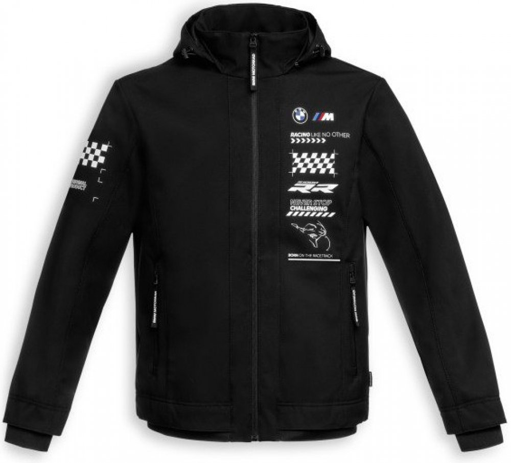 - Potisk loga BMW Motorrad a závodní vlajky na pravém rukávu