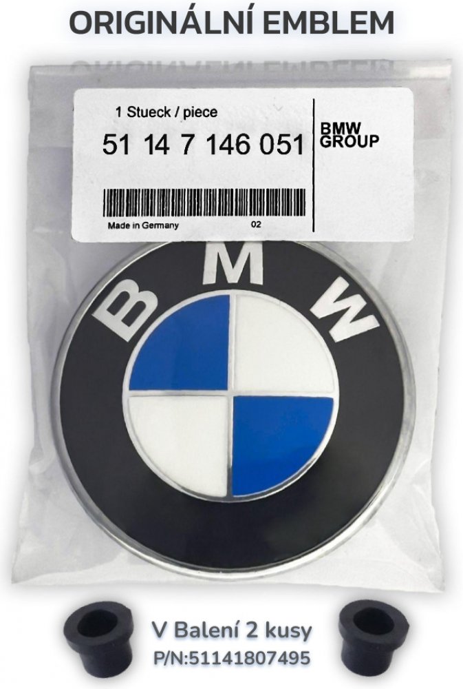 Tento emblém má číslo dílu: 51-14-7-146-051.Pro uchycení emblému na kufr jsou použity 2 kolíky, jejichž rozměry jsou vnější 60 mm a vnitřní 51 mm.