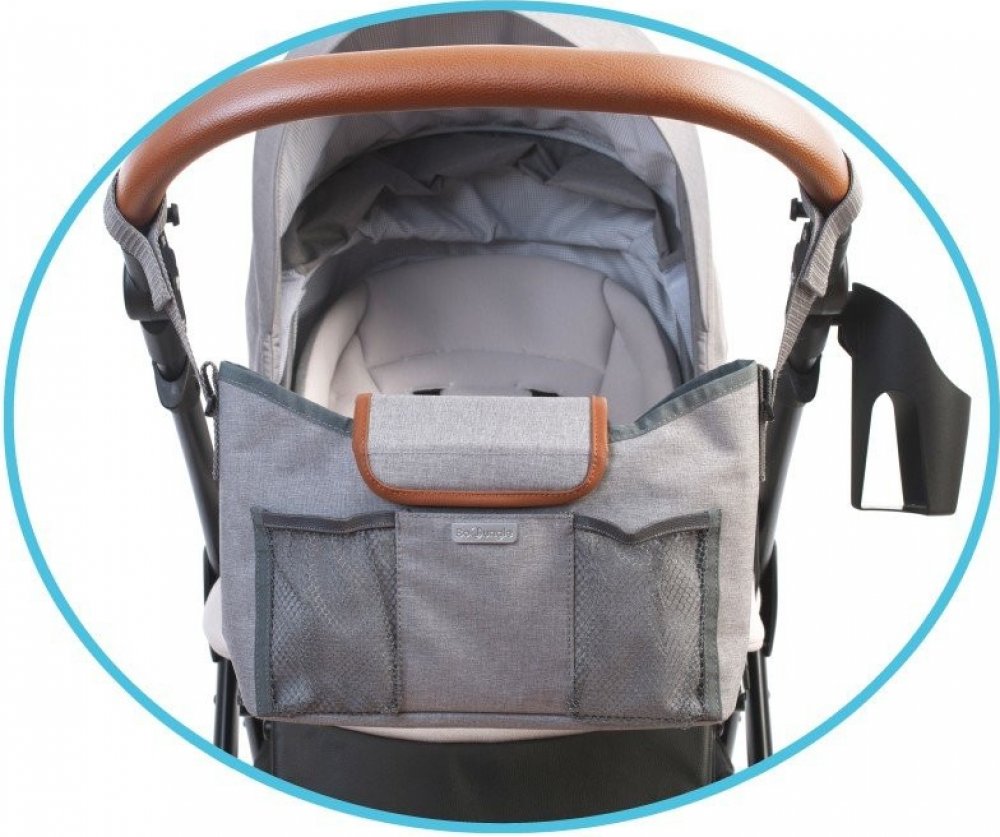 Organizér vhodný ke kočárku nebo golfovým holím. s 2 kapsami na lahve, velkým úložným prostorem uprostřed a síťovanými kapsami zvenku zesílené dno upevňuje se na rukojeť pomocí pásků se suchými zipy rozměry: šířka 32cm x hloubka 11cm x výška 21cm materiál: 100% polyester