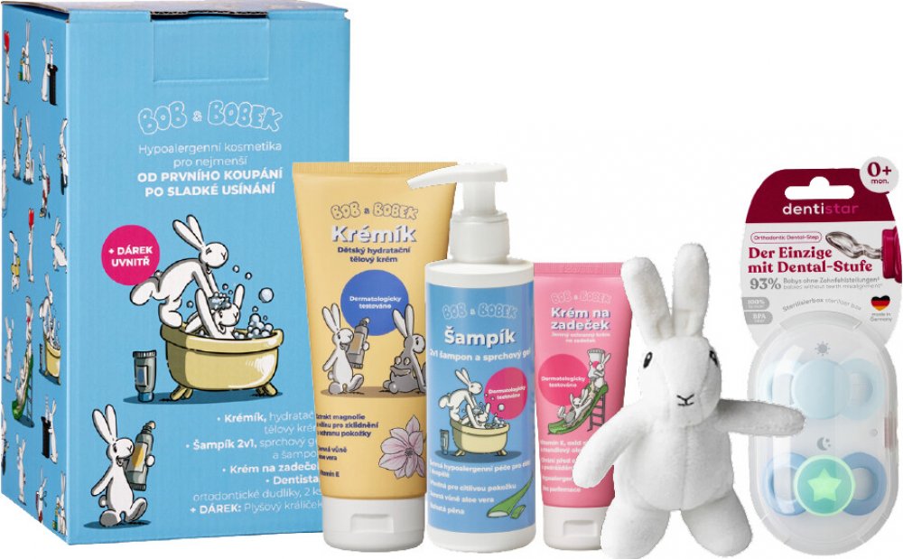 Dárek, který potěší miminko i rodiče. Hypoalergenní, dermatologicky testovaná péče šetrná k citlivé dětské pokožce, vhodná už od prvního dne, spolu s ortodontickými dudlíčky Dentistar proti riziku zubních anomálií. Originální dárek na baby shower, praktický dárek ku příležitosti narození miminka nebo milý „jen tak“ dárek.Bob a Bobek "Baby Blue", kosmetická dárková sada pro miminko (0-6 měsíců)