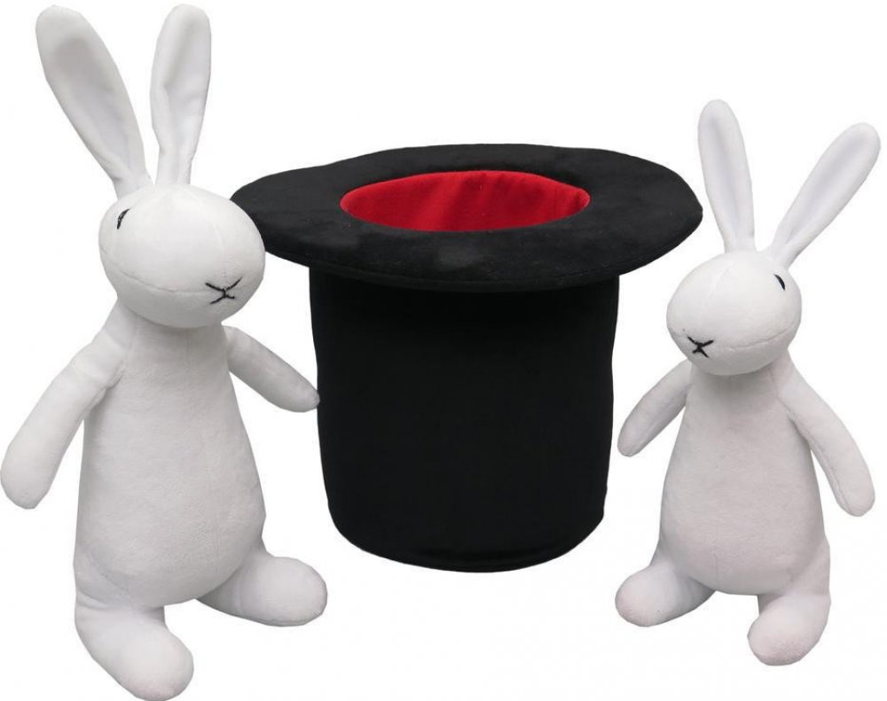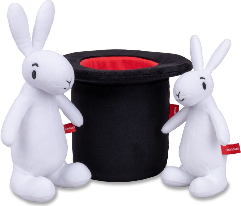 Králíci Bob a Bobek maňásci na ruku i s kloboukem kouzelníka Pokustóna. 3dílná sada textilních postaviček z příjemně měkoučkého materiálu. Bob 42cm, Bobek 35cm a klobouk 20cm.