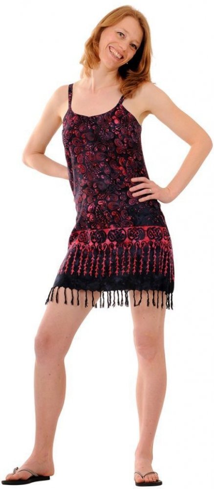 Krátké batikované šaty s úzkými ramínky BOB Batik Neorombe jsou ukončené třásněmi. Pohodové černo - fialové šaty s rovným střihem, který se v bocích rozšiřuje. Příjemná látka je ručně vzorovaná technikou voskové batiky.
