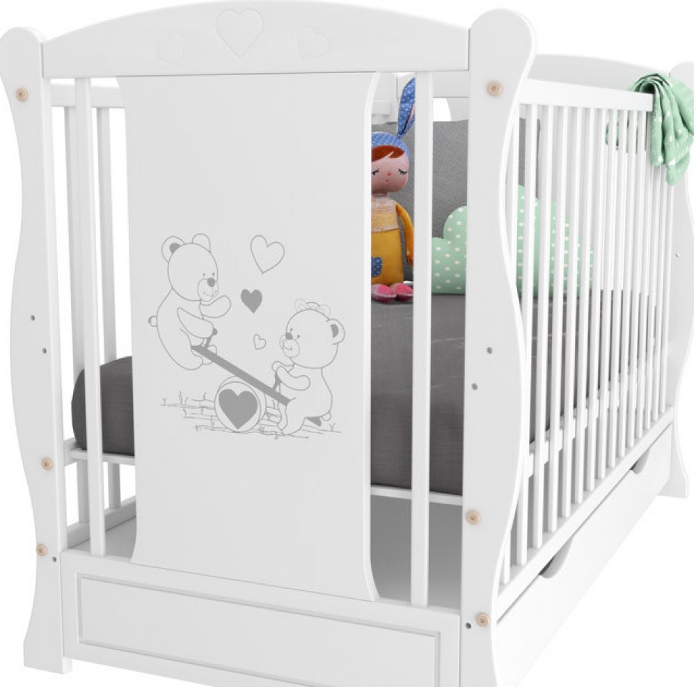 Bobas dětská dřevěná postýlka Máša medvídek bílá se šuplíkem