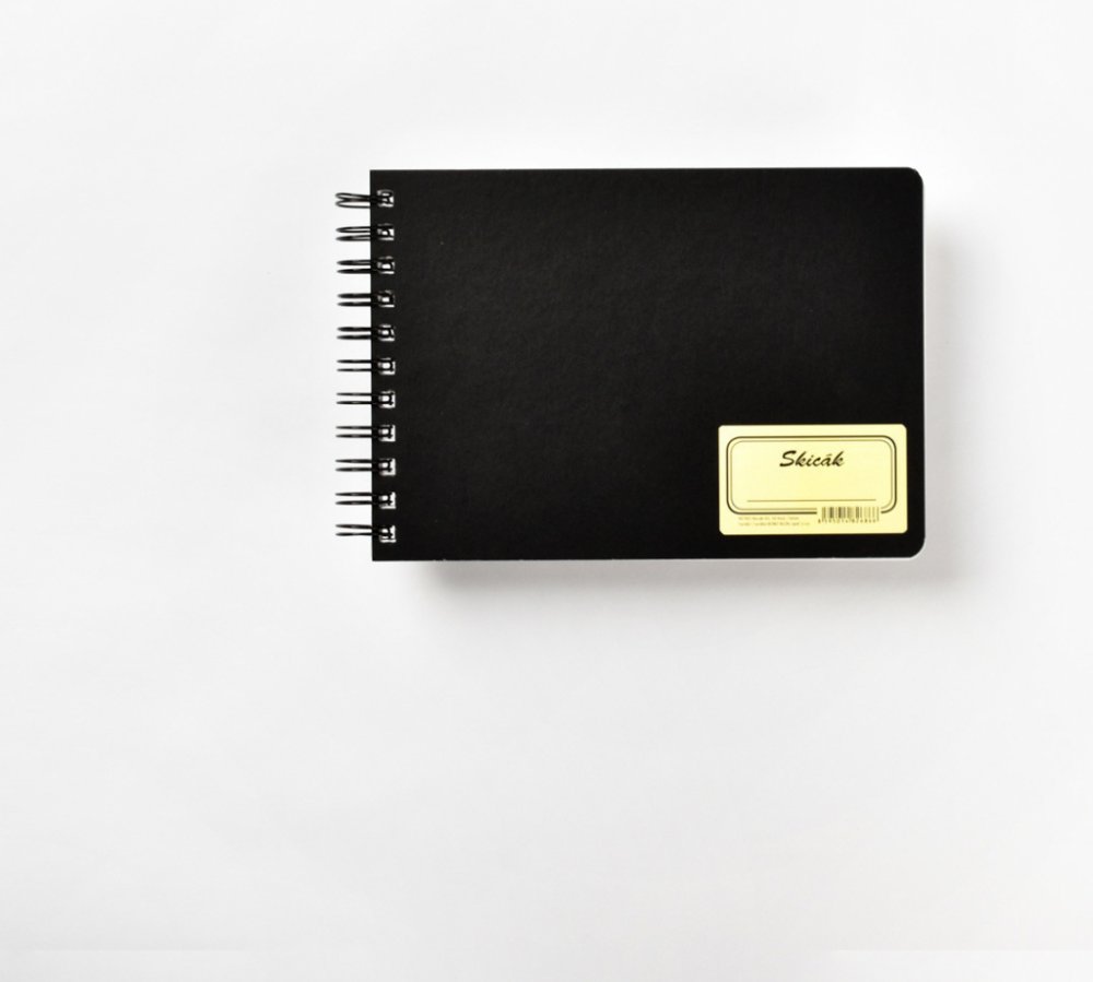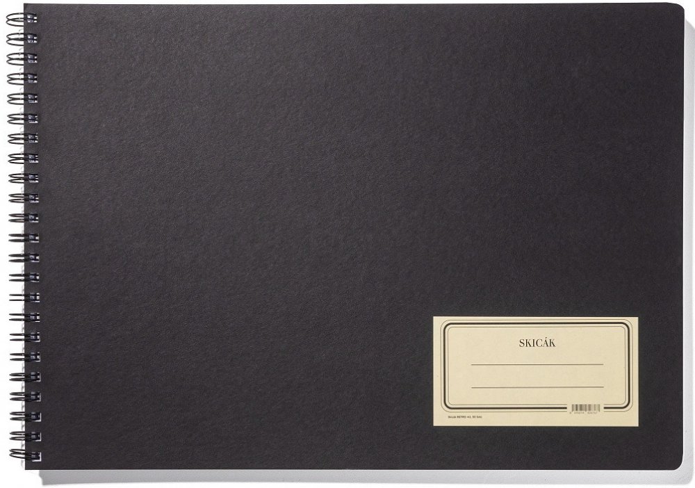 Skicák, A5, lepenkové desky, TWIN WIRE vazba, 50 listů (100 stran), papír 190 g/m2.. Skicák vhodný pro umělecké kreslení a malování pastely a pastelkami, tuhou nebo obyčejnou tužkou v praktickém provedení. Čím budete malovat a kde, je jen a jen na vás. Můžete ho totiž vzít s sebou vlastně kamkoli. Díky praktickému formátu A5 vám nezabere skoro žádné místo a máte ho tak vždy při ruce. Vlastnosti skicáku Retro A5 Pevné vrchní a spodní lepenkové desky o gramáži 600 g/m2 a 1200 g/m2 chrání 50 listů. Kartonové desky mají zakulacené rohy. Obálka má černou barvu. Gramáž papíru je vysoká, 190g/m2 bezdřevý ofset. Na přední obálce je jednořádkový štítek pro pojmenování vašeho nového skicáku. Celý skicák je svázán dvojitou kroužkovou spirálou TWIN WIRE v černé barvě. TWIN WIRE vazba skicáku BOBO. TWIN WIRE vazba je nejdokonalejší způsob použití spirály v knihařské vazbě. Umožňuje snadné otáčení listů až o 360° bez vzájemného posunutí stránek. Sešit můžete nechat otevřený na zvolené stránce a samovolně se nezavře narozdíl od šitých vazeb.