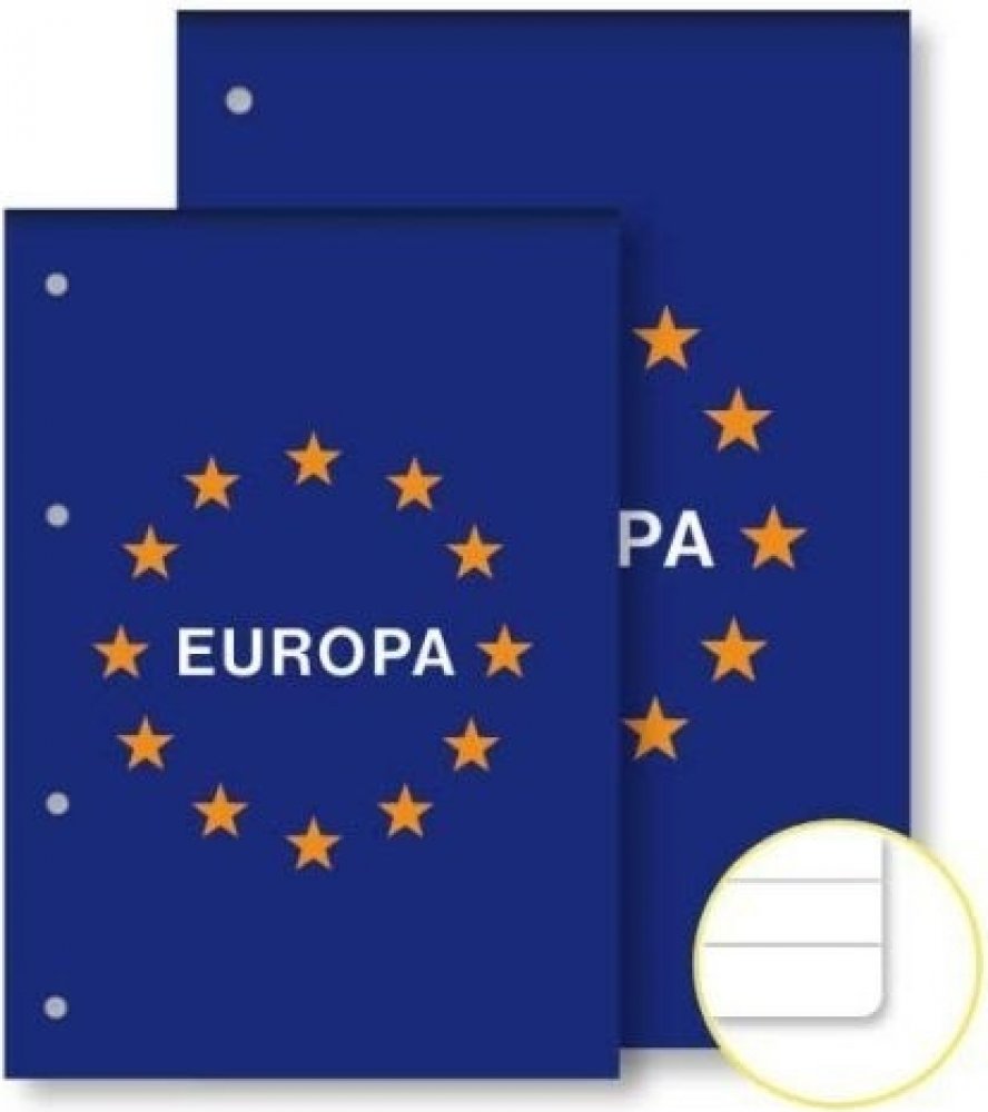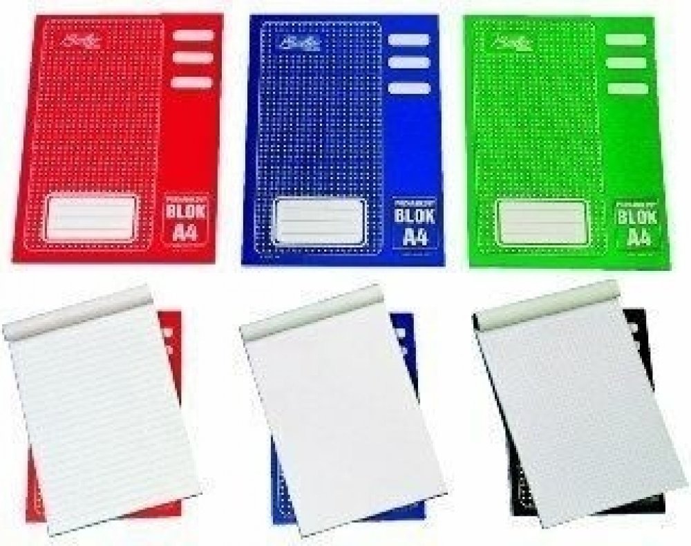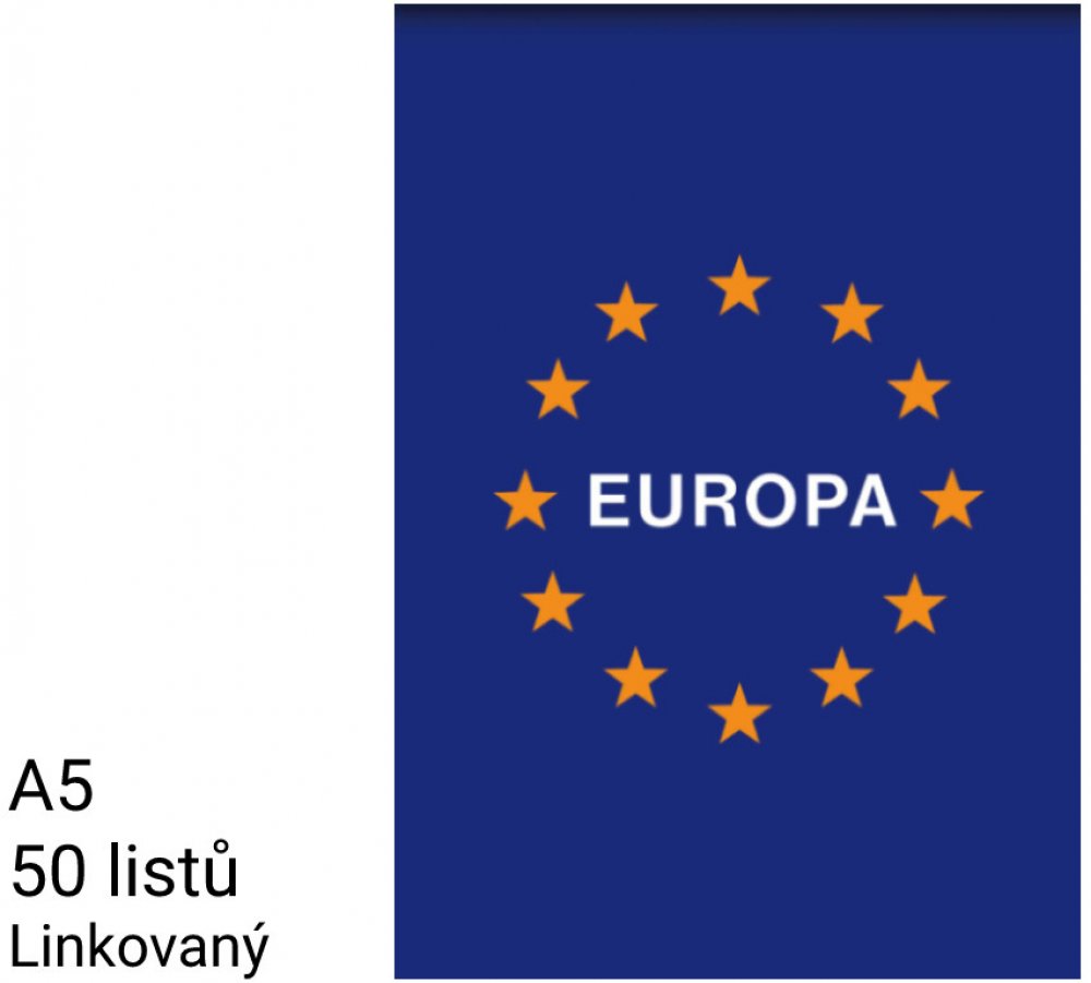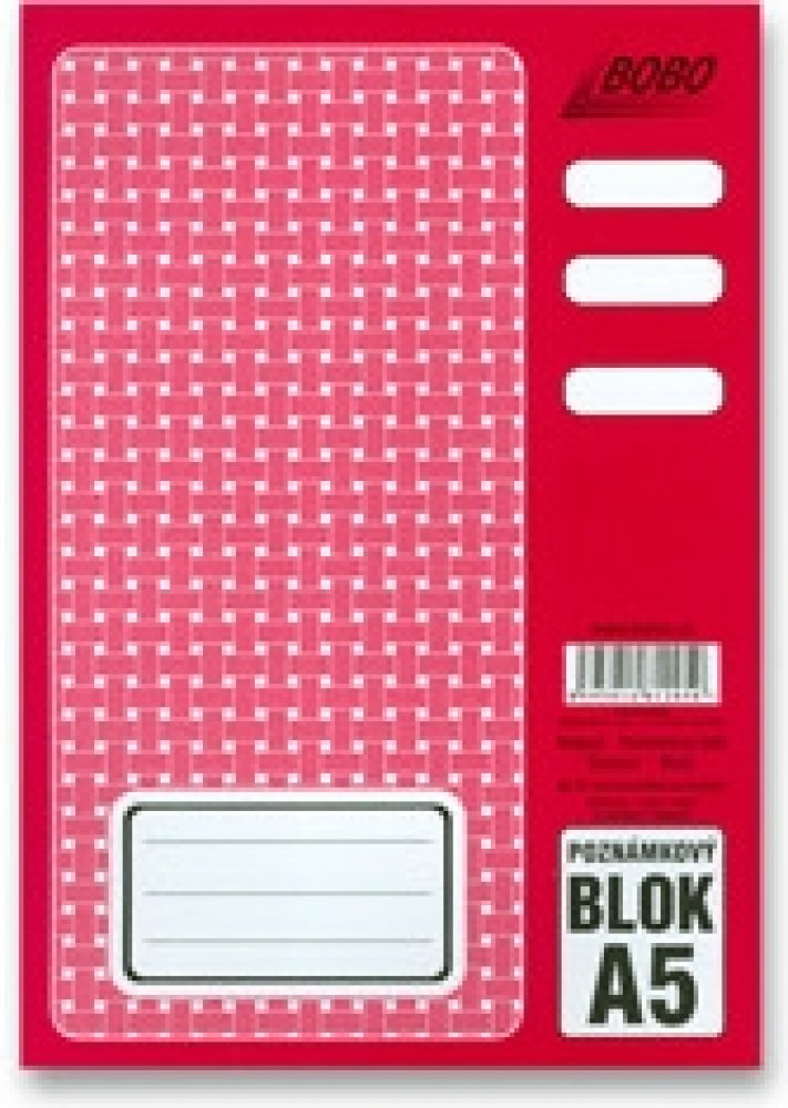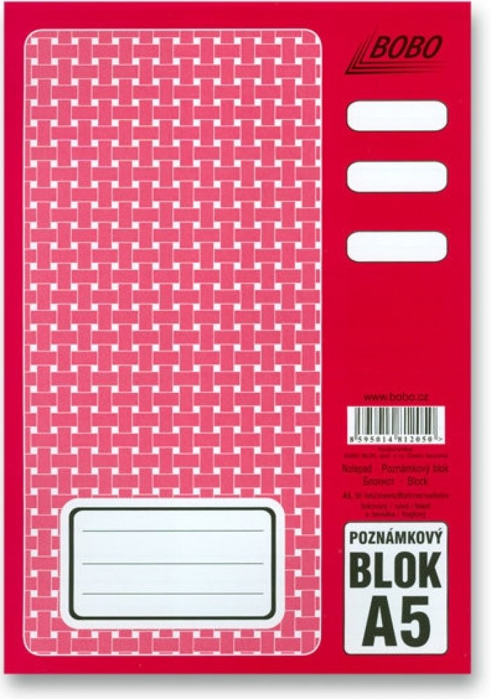 Poznámkový blok formát A5, bezdřevý bělený papír 60 g/m2, lepená vazba na kratší straně, euroděrování pro archivaci na delší straně, zavěšená obálka, lineatura: linka 8 mm, 50 listů.