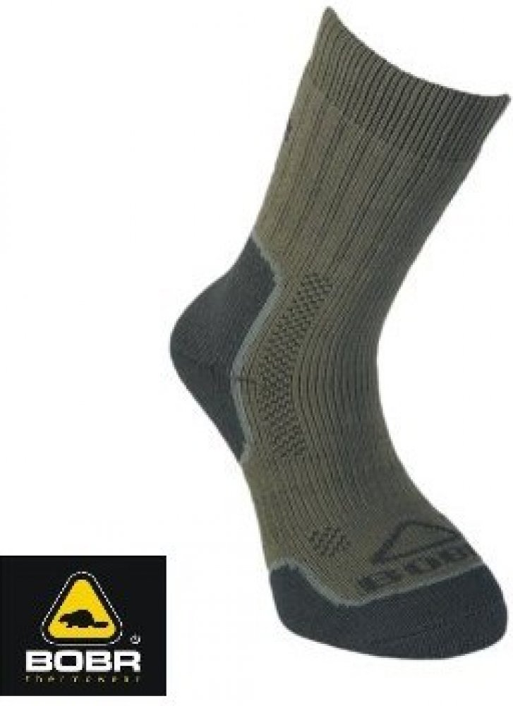 Ponožky BOBR – ZÁTĚŽOVÉ se stříbrem a roční zárukou proti prošlapání jsou pro celodenní práci a pohyb, při kterém vytváříte vlhkost na těle. Tyto dvouvrstvé celoroční ponožky mají uvnitř polypropylén – duté vlákno a ve vrchní vrstvě bavlnu, která odsává pot z těla směrem ven. Drenážní kanály větrají Vaší nohu a zesílené chodidla garantují vysokou odolnost proti oděru a zaručují měkký došlap. Stříbro, vplétané do ponožky působí antibakteriálně a posilovací lemy drží ponožku i ve volné obuvi.