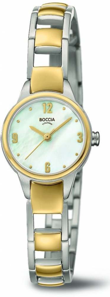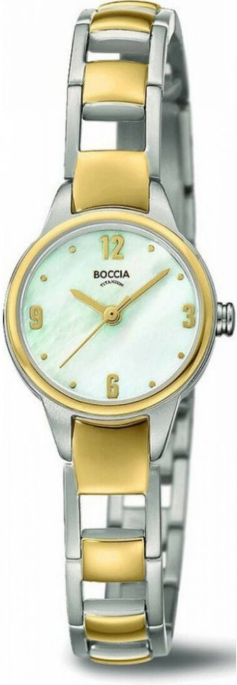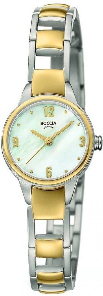 Dámské hodinky Boccia Titanium 3277-02 mají velmi povedený design založený na kulatém tvaru titanového pouzdra a neotřelém provedení ciferníku s perleťovou barvou. Titanový tah pak skvěle ladí s pouzdem. Model 3277-02 je vybaven minerálním sklíčkem, jež je velice odolné vůči nárazům či poškození. Vodotěsnost těchto hodinek je 30M - mytí rukou, déšť.