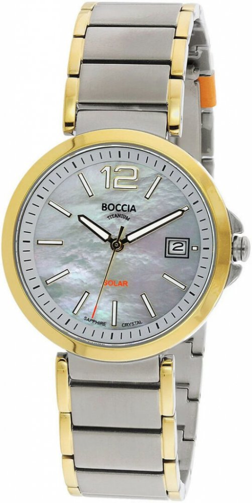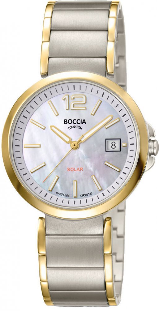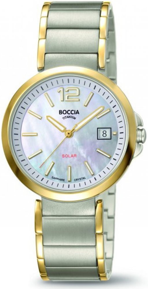 Boccia Titanium analogové titan titan 50 m solární 61 g safírové elegantní dámské solární Solar kulaté vícebarevná bílá skládací spona 1.4 cm s luminiscencí