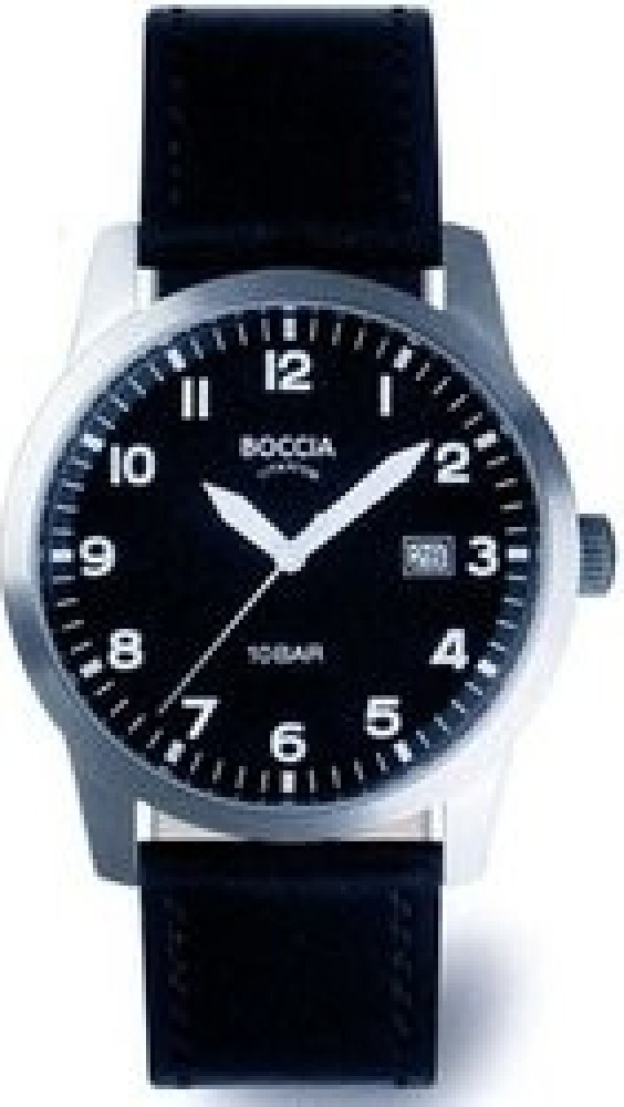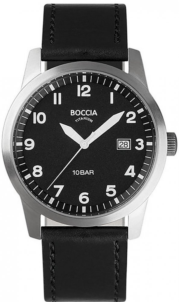 Pánské hodinky Boccia Titanium 3631-01 mají černý ciferník s bílými indexy, na kterém se nachází také ukazatel data. Titanové pouzdro skvěle doplňuje černý kožený řemínek. Hodinky jsou vodě odolné do 10 atmosfér.