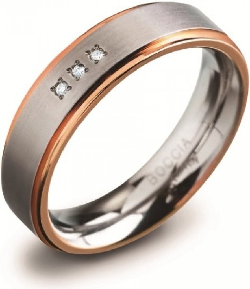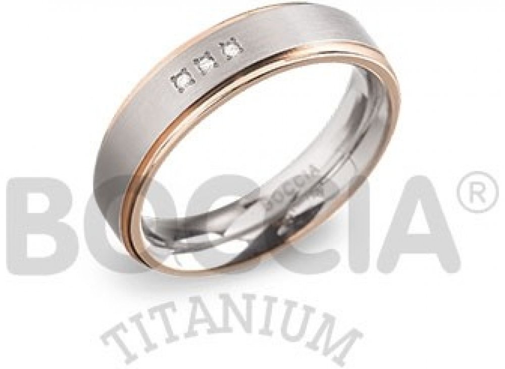 BOCCIA TITANIUM 0134-02 NOVINKA!v ČR v podeji 11-2014 Dámský kombinovaný prsten - kroužek. Na krajích zlacené kroužky uprostřed antialergický titan. Prsten je zdoben třemi diamanty o ryzosti 0,015ct. Šíře prstenu je 3,5 mm. Velikosti: můžete objednávat ve velikostech 48-71. Titan je šedý až stříbřitě bílý, lehký a tvrdý kov. Ve šperkařství a hodinářství je rozšířený především pro svou ANTIALERGIČNOST-nízkou váhu a tím i celkově příjemný k nošení.Vyznačuje se mimořádnou chemickou stálostí - je zcela netečný k působení vody a atmosférických plynů a odolává působení většiny běžných minerálních kyselin i roztoků alkalických hydroxidů. V současnosti je titan preferován zejména pro fyzikálně-chemické vlastnosti, mechanickou pevnost a dobrou korozivzdornost.