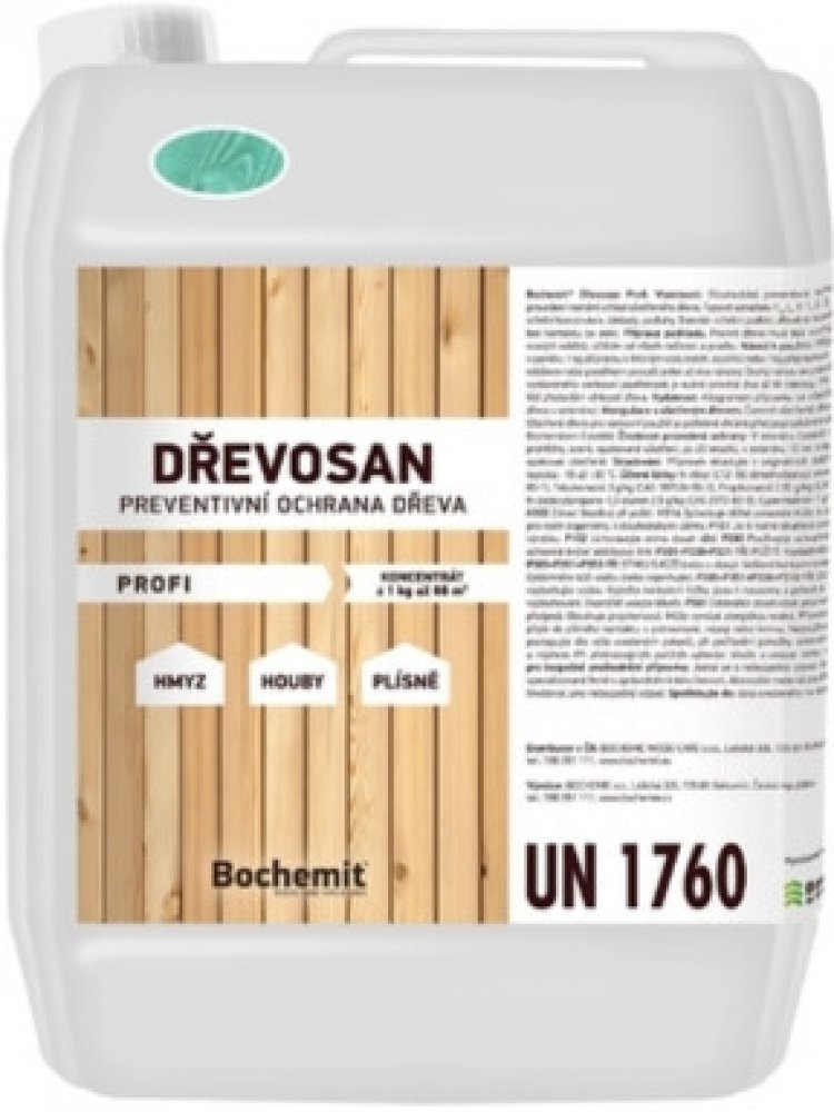 Vodou ředitelná impregnace pro dlouhodobou ochranu dřeva proti hmyzu a houbám. Bochemit Dřevosan Profi je vodou ředitelný impregnační přípravek určený pro preventivní ochranu stavebního dřeva proti dřevokaznému hmyzu, houbám a plísním v interiéru i exteriéru. Po naředění se přípravek dobře vsakuje do dřeva, nevytváří na jeho povrchu film a nezanechává nepříjemný zápach. Chrání dřevo v třídách použ...