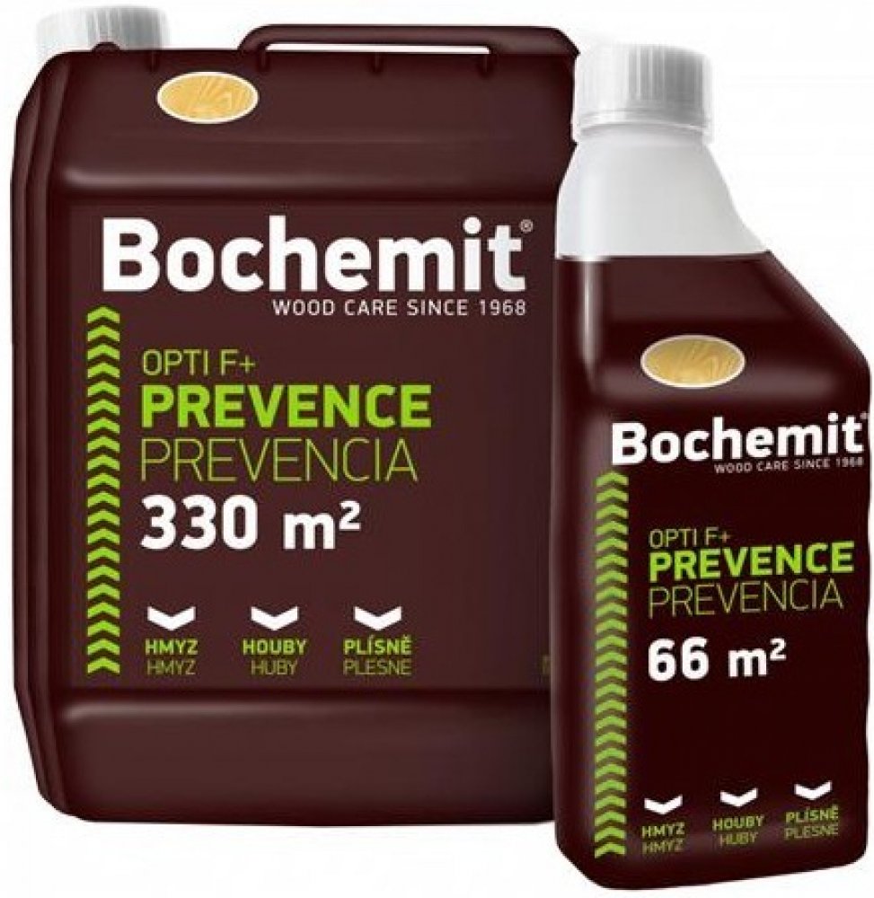 Bochemit Opti F + je koncentrovaný kapalný fungicidní a insekticidní přípravek pro dlouhodobou preventivní ochranu dřeva proti plísním, dřevokaznému hmyzu. Vhodný pro ochranu dřeva v interiéru (střešní konstrukce, podlahy) i exteriéru (střešní podbití, pergoly, ploty). Výrobek po aplikaci vsakuje do dřeva, na povrchu ošetřeného dřeva netvoří vrstvu, ošetřené dřevo nezapáchá. Bezbarvá varianta nezpůsobuje žloutnutí dřeva. Při trvalém zabudování dřeva v exteriéru (třída použití 3) je nutno ošetřené dřevo následně překrýt vhodným krycím nátěrem (např. Bochemit® Estetik)