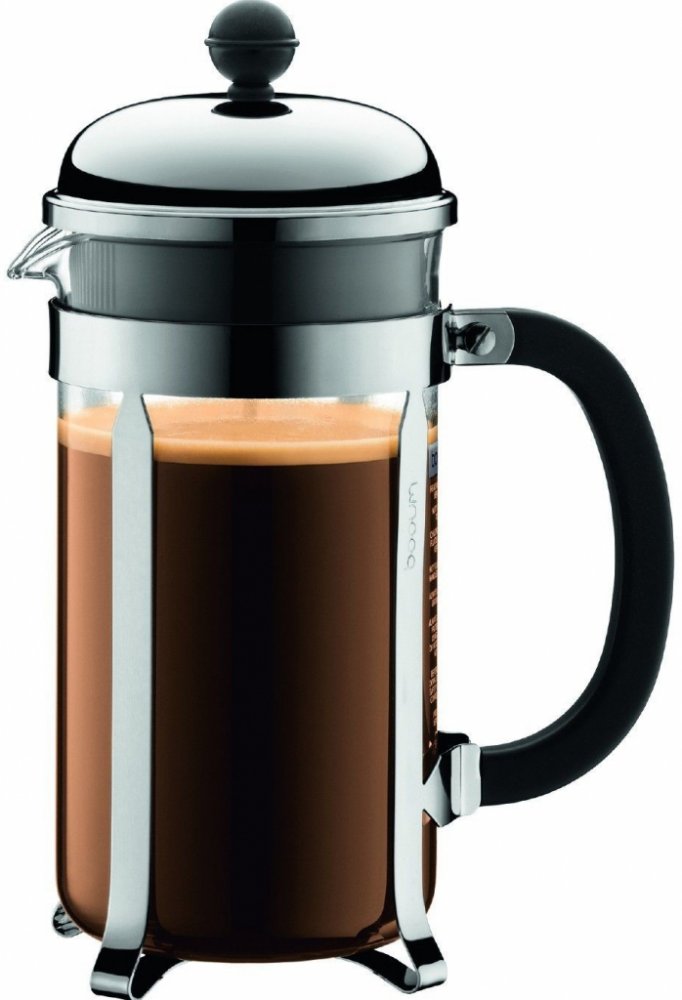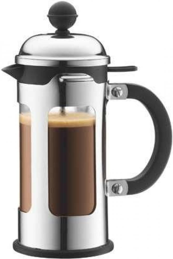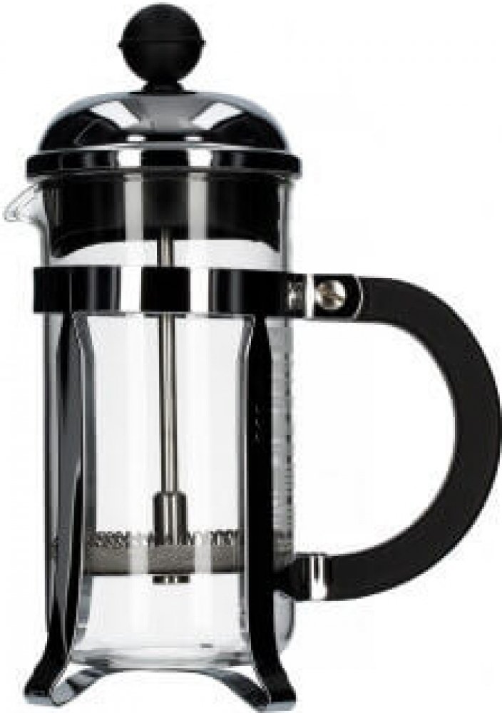 Stlačovací French press z pochromované oceli, rukojeti z tvrzeného plastu a skleněnou nádobou.Víčko potočením jednoduše uzavřete.Kávovar má jemné nerezové sítko. Všechny díly lze mít v myčce nádobí. Jednoduché použití:Sundáte horní víčko i s pístem a nasypete potřebné množství kávy. Potom ji zalijete horkou vodou (ne vroucí, max. 3 cm pod vrchní okraj nádoby). Zamícháte dřevěnou nebo plastovou lži...