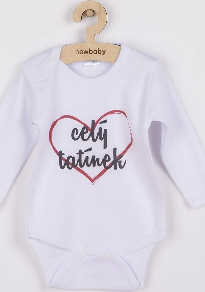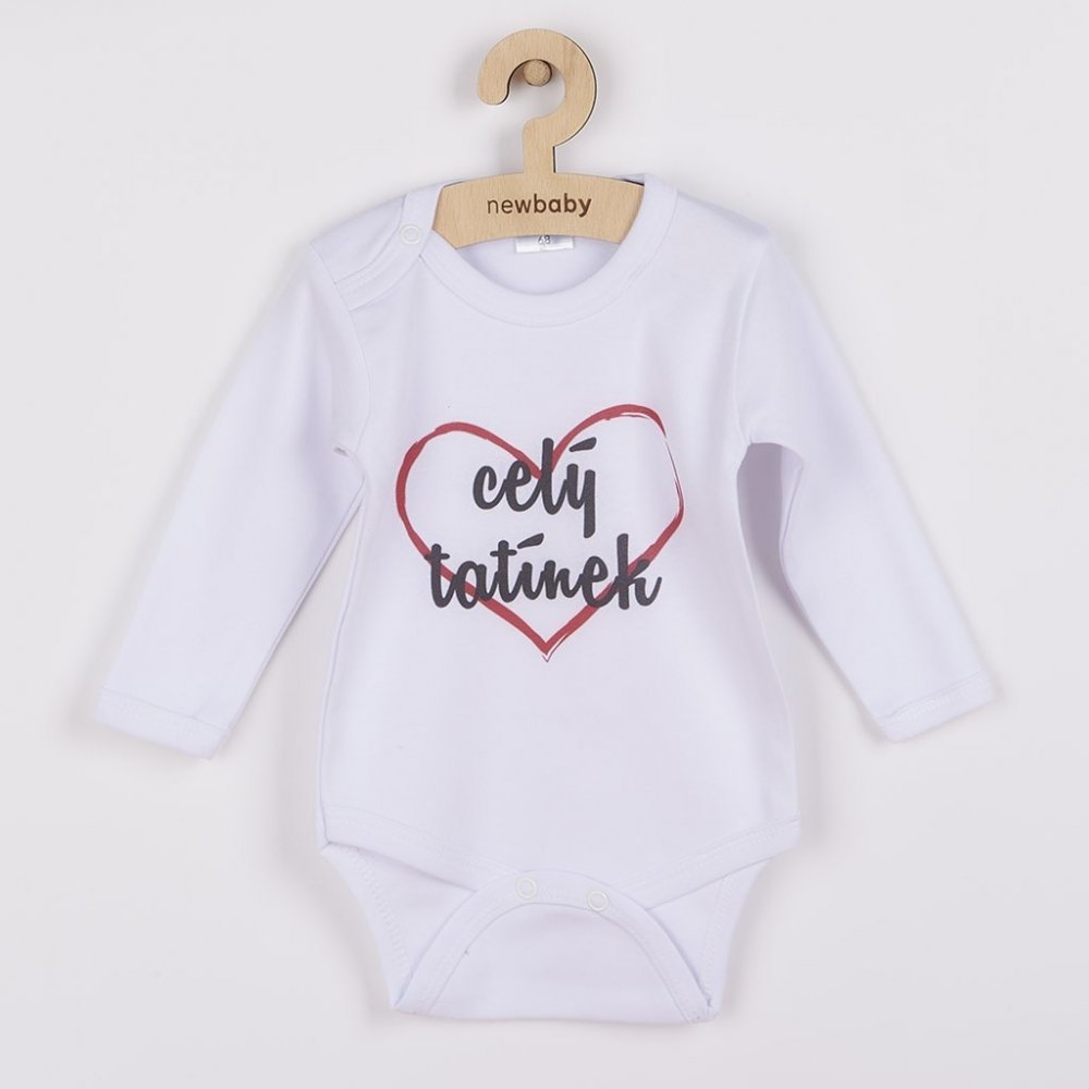 Originální bavlněné kojenecké body s dlouhým rukávem New Baby, s vtipným nápisem celý tatínek. Barvy použité k potisku jsou certifikované a vhodné pro miminka. Je vyrobeno z příjemného a kvalitního materiálu, ve kterém se bude Vaše miminko cítit příjemně. Body má zapínáni na cvočky na ramínku a mezi nožičkami, což usnadňuje oblékání a přebalování. Dopřejte Vašemu miminku vyniknout v originálním body. Složení: 100% bavlna. Rozměry: obvod kolem hrudníku cca 42 cm, délka rukávu cca 23 cm, celková délka cca 38 cm.Produkt české značky