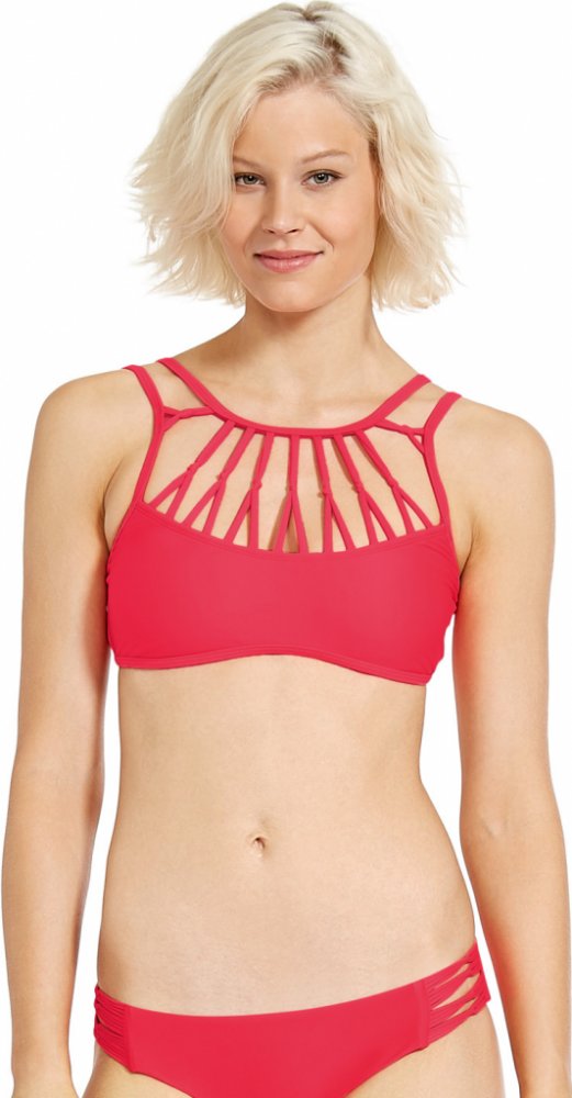 Vrchní díl: Smoothie Diva Ivy New - vrchní díl ke krku s několika proužky vepředu vytvářejícími zajímavý detail Spodní díl: Smoothie Diva Bikini - klasický spodní díl s překříženými elastickými proužky po stranách Materiál: 80% nylon, 20% spandex Barva: červeno-růžová "Diva"