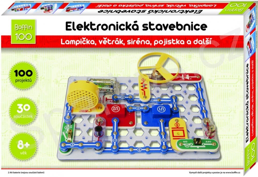 Elektronická stavebnice Boffin 100 obsahuje 30 součástek, z nichž lze postavit tyto projekty:
