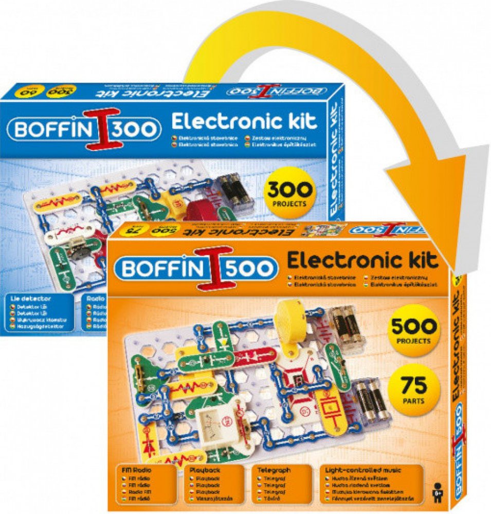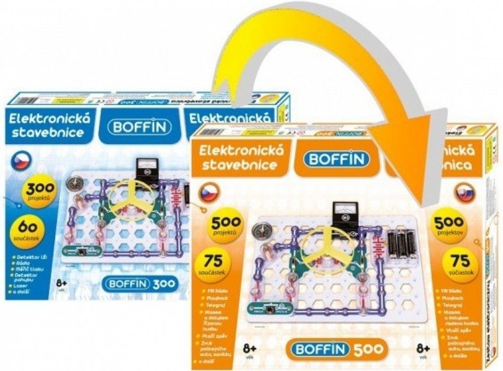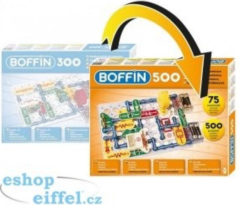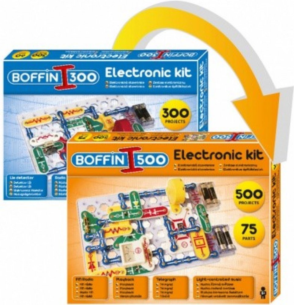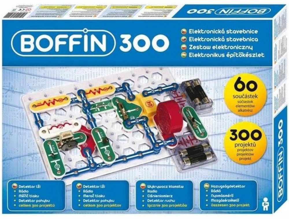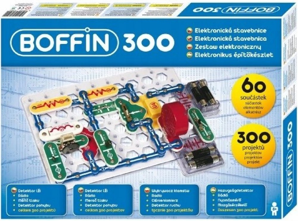 Stavebnicí Boffin 300 i 500 můžete napomoci dětem proniknout do tajů fyziky a elektroniky, a to zábavnou formou. Obsahuje velké množství součástek, ze kterých se dá po rozšíření tímto setem sestavit 500 projektů. Pro lepší pochopení je manuál přiložen i na DVD. Základním prvkem je deska a manuál podrobně ukazuje, co vše za jednotlivé součástky přidávat.