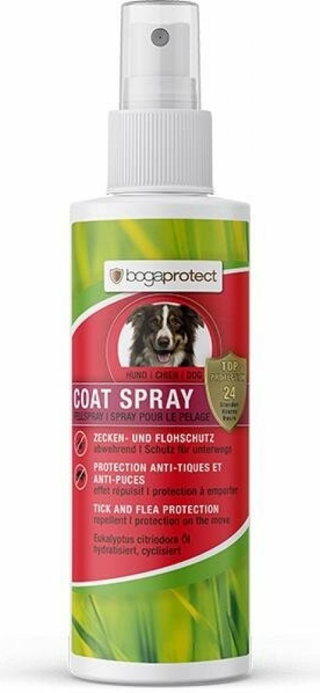 Kvalitní antiparazitní repelent Bogaprotect Coat Spray je pro psa vynikající ochranou proti klíšťatům a blechám. Účinnou látkou je Eucalyptus citriodora oil, který je hydratovaný a cyklizovaný. Jedná se o nejúčinnější repelent přírodního původu, který je získáván z listů eukalyptu citronového. Bogaprotect Coat Spray stačí jednoduše nastříkat na srst psa před vycházkou či pobytem v přírodě. Po jeho aplikaci je váš pes okamžitě chráněn až 24 hodin proti blechám a klíšťatům. Klíčové vlastnosti antiparazitního spreje Bogaprotect Coat SprayNová generace repelentní ochrany psa proti klíšťatům a blechámÚčinná látka Eucalyptus citriodora oilZískává se z listů eukalyptu citronovéhoRepelent Bogaprotect Coat Spray chrání psa až 24 hodinStačí jednoduše nastříkat na srst před vycházkou či pobytem v příroděOkamžitý účinekPoužití:Před použitím dobře protřepejte. Před vycházkou nastříkejte několikrát pumpičkou přímo na srst, zejména v oblasti nohou a tlapek.