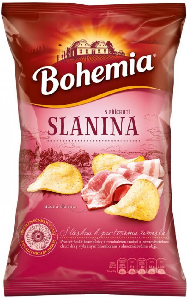 cena za 1 kg je 458.82 kčsmažené bramborové lupínky s příchutí slaninySložení :brambory, slunečnicový olej (34 %), mořská sůl (1,2 %), sušená slanina, sušený sýr, sušená rajčata, příroní aroma, kvasničný extrakt, cukr, sušená cibule, sušená rajčata, aroma, sušený česnek, kyselina (kyselina citronová), barvivo (paprikový extrakt)