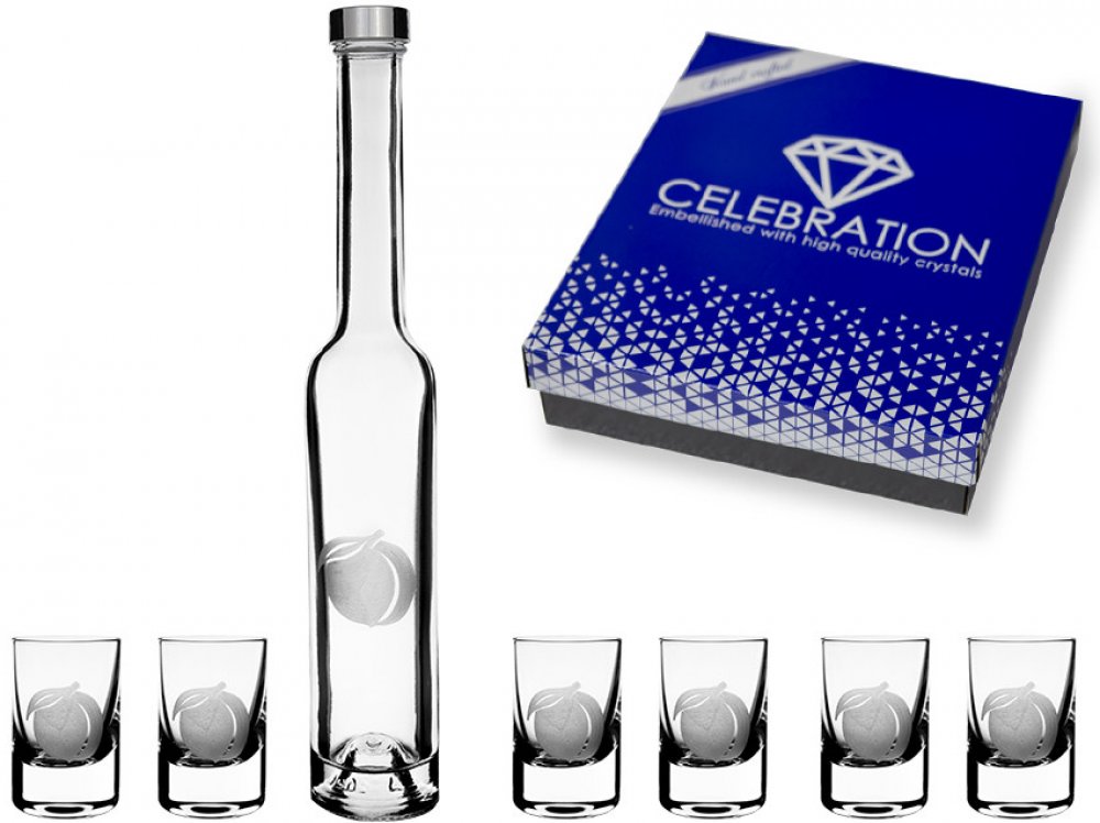 Elegantní sada na pálenku. Na lahvi i každé panákovce je vypískovaný motiv meruňky. Nalejte si svoji oblíbenou meruňkovici do těchto skleniček. Skvěle z nich chutná. Baleno v dárkové krabici. V současné době velmi oblíbený a krásný dárek. Vychutnejte si svoji oblíbenou pálenku z těchto exkluzivních skleniček a užijte si svoji výjimečnou chvíli.