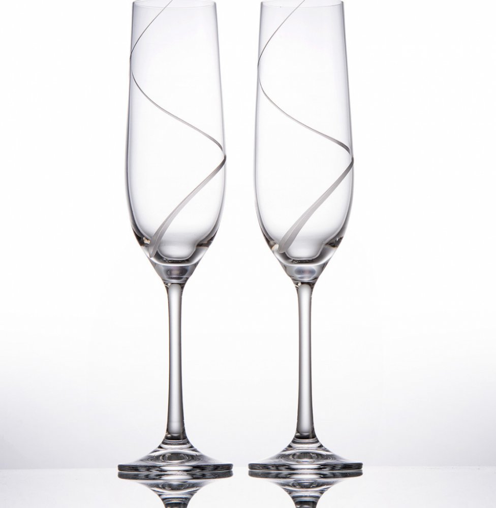 Set dvou sklenic na sekt s ručně broušným motivem spirály. Motiv působí vzdušně a moderně.