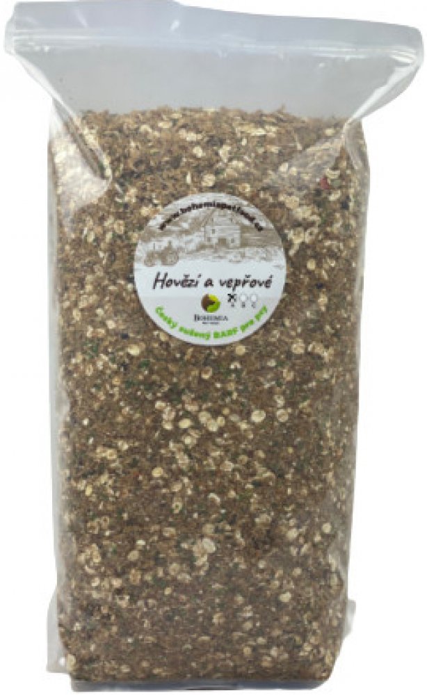 Negranulovaná, míchaná ryze česká receptura pro štěňata, dospělé a aktivní starší psy. Receptury A jsou nejbohatší na bílkoviny, tuky, vitamíny a zejména minerály. S nižším obsahem uhlohydrátu. Pro koho je vhodná A receptura: Receptura je vhodná pro štěňata plemen, která budou mít v dospělosti max. 25kg. Pro dospělé psy všech plemen žijící tzv. aktivním životním stylem, či jsou ve zvýšené fyzické a psychické zátěži, vhodné pro březí a kojící feny. Krmivo mohou i starší psi všech plemen pokud je jejich aktivita vysoce nadprůměrná. Složení: Hovězí (kýta, ohryzek, vemeno, plíce, srdce, játra, býčí žlázy, jazyk, dršťky, hrtan, čenich), vepřové (žebra, játra, lopatky, plíce, srdce, hrtany, kýta), ovoce a zelenina (jablka, hrušky, mrkev, zelí, celer, kapusta, brokolice, dýně, řepa, zelený hrášek mladý, špenát, petržel, maliny, jahody, rybíz, ostružiny, borůvky), špalda, ječmen, semena a ořechy (lněné, slunečnicové, sezamové, dýňové, podzemnice olejná, ostropestřec mariánský), celá sušená vejce, sušené kozí mléko, drcené paroží jelena evropského, pivovarské kvasnice (odhořčené), bylinky (bazalka, oregano, tymián, saturejka, šalvěj, fenykl, skořice, zázvor, kurkuma, libeček, kopr, majoránka). V čem jsou krmiva BOHEMIA jiné, než ostatní krmiva. Zde jsou 3 hlavní rozdíly: 1) Jak je krmivo vyrobeno 2) Z čeho je krmivo vyrobeno 3) Propracovaný výživový plán u kterého je hlavním smyslem pestrost stravy Jak je krmivo vyrobeno: krmivo je míchané, nikoliv granulované. Ingredience jsou sušené horkým vzduchem, či mrazem. Pozvolné sušení horkým vzduchem je nejstarší, nejšetrnější a nejpřirozenější způsob uchování potravin, který nám zachová nutriční benefity, trvanlivost a přirozenou vůni. Nepřidáváme žádné syntetické doplňky. Z čeho je krmivo vyrobeno: Všechny ingredience si sami vykupujeme ať už přímo z jatek nebo již sušené od dodavatelů a dále si je sami zpracováváme a mícháme do konečného produktu. Známe každou ingredienci ve složení a také ji přesně definujeme, jako například: srdíčko, jatýrka, žebírka, plíce atd... Nabízíme pestrou stravu pro psy z ingrediencí bohatých natolik, abychom nemuseli přidávat žádná syntetická aditiva v jakékoliv podobě. Propracovaný výživový plán: Vytvořili jsme jeden z nejpropracovanějších výživových plánů, který zahrnuje kompletní stravu, přílohy, konzervy a pamlsky. V kompletních recepturách naleznete pestrost nejen v živočišné, ale i rostlinné části v každé fázi života Vašeho psa. Kompletní stravou se nám prolíná doplňková strava v podobě pestrých příloh k našim masovým konzervám, či kusu čerstvého masa, který si zakoupíte třeba u Vašeho řezníka. Nakonec excelentní sušené pamlsky z nejlepších částí zvířete, které se opět nebojíme pojmenovat, kýta, prsa, hřbet apod. Tento typ pamlsku je nejen odměnou, ale zejména tím nejzdravějším doplňkem výživy v podobě těch nejkvalitnějších bílkovin a esenciálních aminokyselin, které jsou základním stavebním kamenem Vašeho psa a jsou součástí téměř všeho v jeho organismu. Doporučené dávkování pro štěňata Od 8–10 týdnů, doporučujeme pozvolna přidávat stravu BOHEMIA do jídelníčku. Po 8 týdnech je doporučené denní dávkování 2 % z celkové aktuální hmotnosti štěněte. Doporučené dávkování pro dospělé psy Od 12 měsíců doporučujeme 1 - 2% z aktuální váhy psa. Doporučené dávkování pro seniory Od 8 let doporučujeme 1% z aktuální váhy pasa Vždy je potřeba psa sledovat, reagovat a optimalizovat dávku dle jeho aktuální váhy. V případě že Váš pejsek bude hubnou, tak denní dávku zvýšit a když bude v nadváze, tak naopak snížit. Jak podávat Krmivo zalijte horkou vodou 0,5 - 1 cm nad úroveň směsi a nechte několik minut nasáknout a vychladnout. I když se už jedná o kompletní krmivo, můžete přimíchat i další maso z konzervy Bohemia nebo jiné ingredience dle libosti. Receptura splňuje nutriční hodnoty Receptura Bohemia Pet Food je formulována dle doporučení evropského úřadu FEDIAF. Výroba je schválena Ústředním kontrolním a zkušebním ústavem zemědělským (UKZUZ) a Státní veterinární správou.