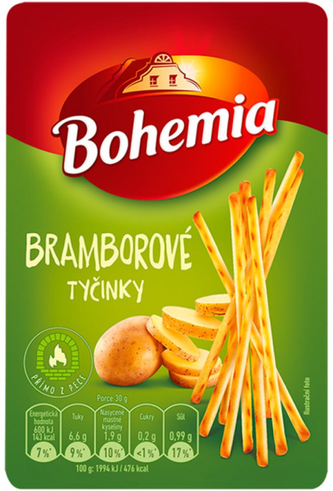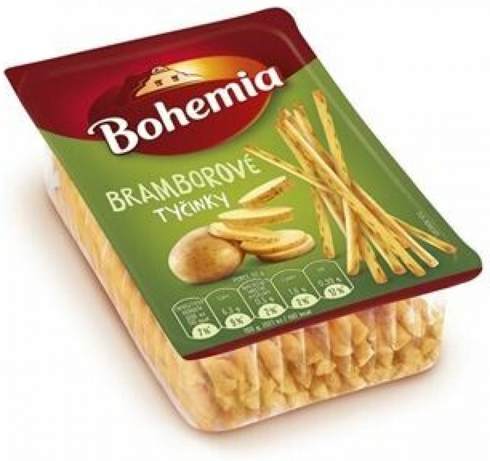 cena za 1 kg je 306.92 kčBohemia tyčinky bramborové jsou vždy do křupava pečené, krásně tenké a ochucené tak, aby chutnaly co nejlépe.Složení :Bramborový škrob (30%), PŠENIČNÁ mouka, sušené brambory (15 %), slunečnicový olej, palmový olej, sůl, modifikovaný bramborový škrob, extrakt z droždí, SYROVÁTKA, aroma, koření, barvivo (kurkumin).