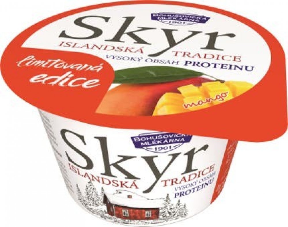 Cena se může v jednotlivých regionech lišit. -- Zakysaný dezert s příchutí manga. Limitovaná edice. Skyr je vyroben tradiční islandskou recepturou. Má hedvábnou strukturu a jemnou mléčnou kyselost s nádechem sladkosti. Ideální svačina s konzistencí podobnou řeckému jogurtu, ale s mnohem jemnější chutí. O VÝROBCI Bohušovická mlékárna je jednou z nejstarších českých mlékáren. Byla založena v roce 1901 a v průběhu celého staletí prošla řadou modernizací. Svými produkty úspěšně zásobuje jak tuzemský tak zahraniční trh. V Česku a na Slovensku je známá především sortimentem smetanových krémů Bobík, zakysaných smetan Bohunka, smetan do kávy a kondenzovaných mlék Kapucín. Jako první přinesla na český trh tradiční islandský zakysaný mléčný výrobek SKYR, který je populární po celém světě.