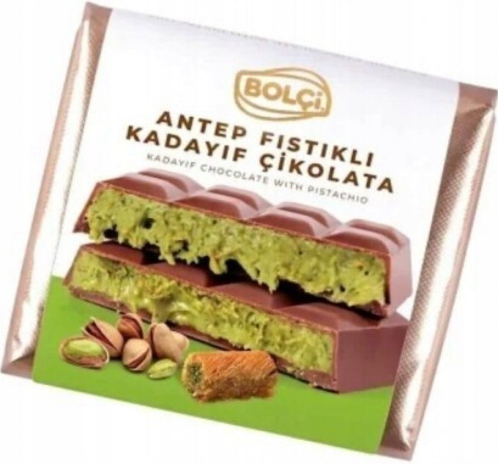Složení: Cukr, Pistácie (13%), Sušené plnotučné mléko (13%), Rostlinný tuk (palmový, Bambucké máslo, Sal, Illipe, Kokum), Kakaové máslo, Kakaová hmota, Sušené odstředěné mléko( 6%), Pražený kadajif (3,2 %) (pšeničná mouka, voda, sůl), sušená syrovátka (mléko) (1,4 %), emulgátor (slunečnicový lecitin, polyglycerol polyricinoleát), aroma (vanilin). Mléčná čokoláda sušená kakaová sušina min: 30 %.
