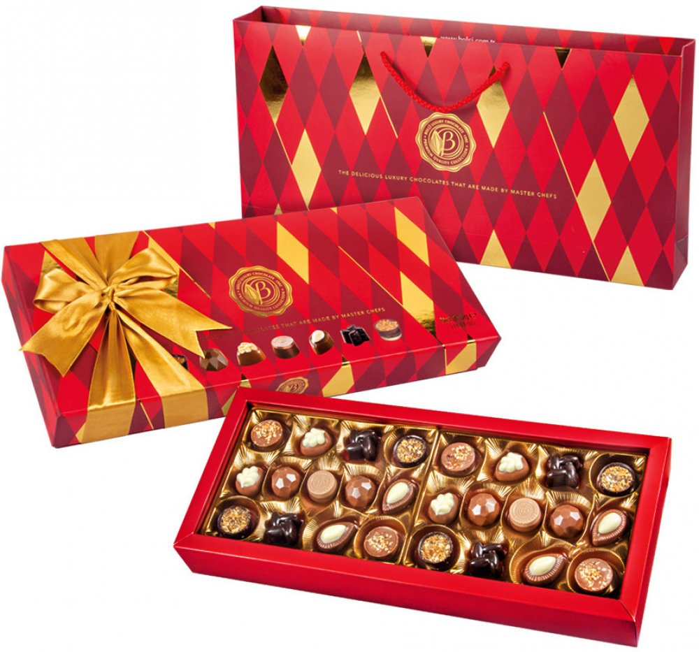 Výběr lahodných pralinek v atraktivním obaluSložení: cukr, kakaové máslo, sušené plnotučné mléko, sušené odstředěné mléko, kakaová hmota, lískové oříšky, slunečnicový olej, máslo, mandle, pistácie, pšeničná mouka, sladový extrakt, emulgátor: slunečnicový lecitin; přírodní vanilkové aroma, citronové aroma, regulátor kyselost (uhličitan sodný)