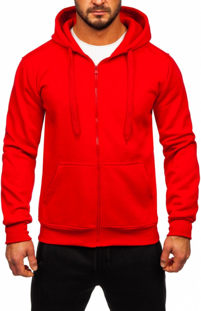 Červená pánská tepláková souprava na zip s kapucí Bolf D004 je must have - model vhodný na každé roční období! Součásti setu jsou mikina s kapucí a tepláky. Klasická mikina se zapínáním na zip. Má praktickou kapuci a dvě boční kapsy. Spodní část a rukávy mikiny jsou zakončeny pružným lemem, který zajišťuje teplo v chladnější dny. Kalhoty jsou nastavitelné v pase pomocí silného pružného lemu a šňůr...