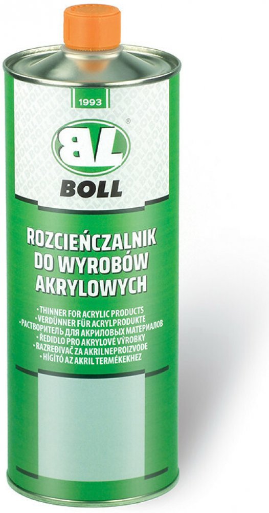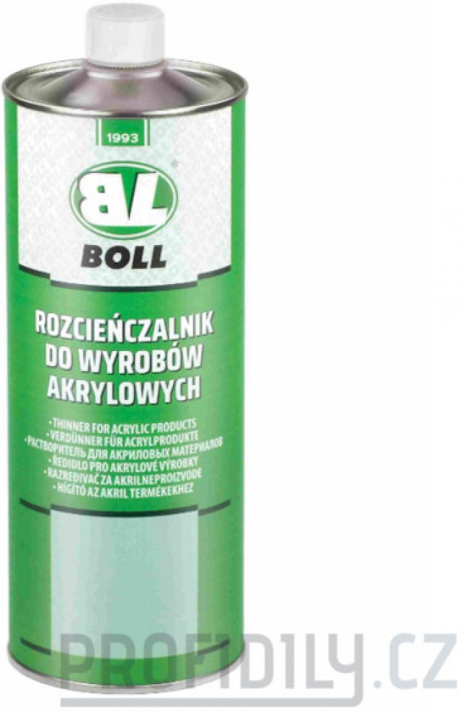 BOLL Ředidlo pro akrylové výrobky, 1LUniverzální ředidlo pro zředění akrylových produktů, jako jsou bezbarvé laky a plnící nátěry. Umožňuje získat požadovanou viskozitu produktu potřebnou pro danou aplikaci.