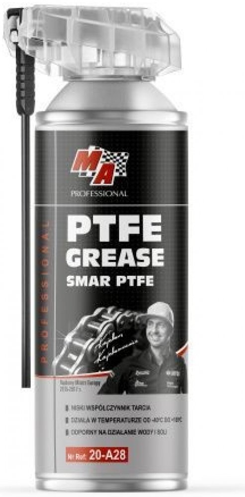 PTFE plastické mazivo je vysoce výkonný produkt na bázi PTFE (tetrafluorethylen), olejů a rozpouštědel. Je to prostředek, který maže, proniká a chrání před nepříznivými vlivy povětrnostních podmínek. Byl vytvořen pro dlouhodobé mazání v nejobtížnějších podmínkách. Tento produkt snižuje a eliminuje tření a opotřebení mazaných dílů. Chrání před působením vody, vlhkosti, solí, kyselin, nečistot, pra...