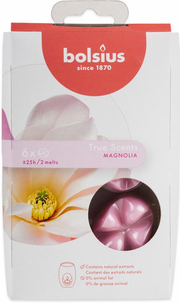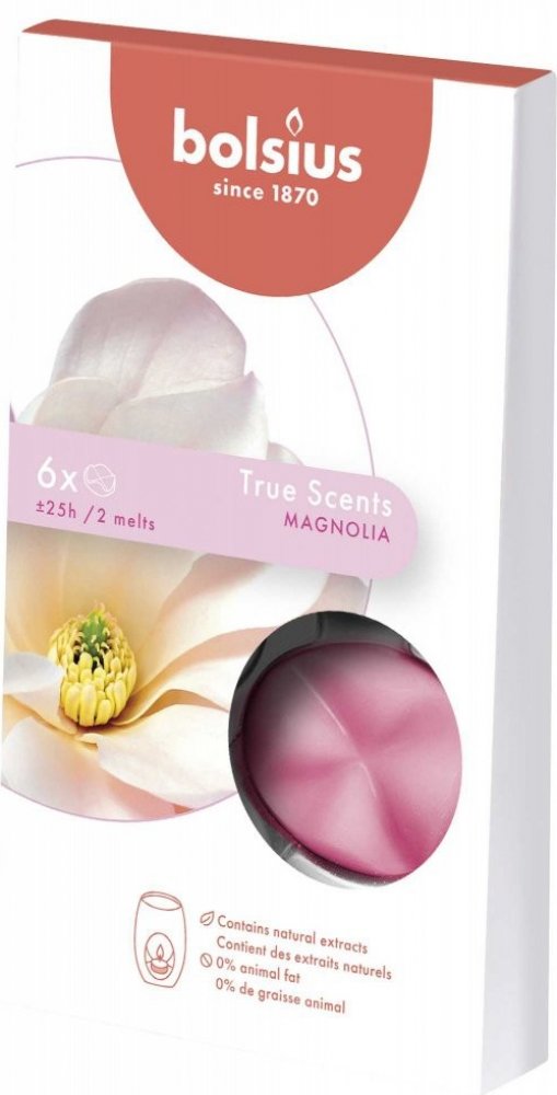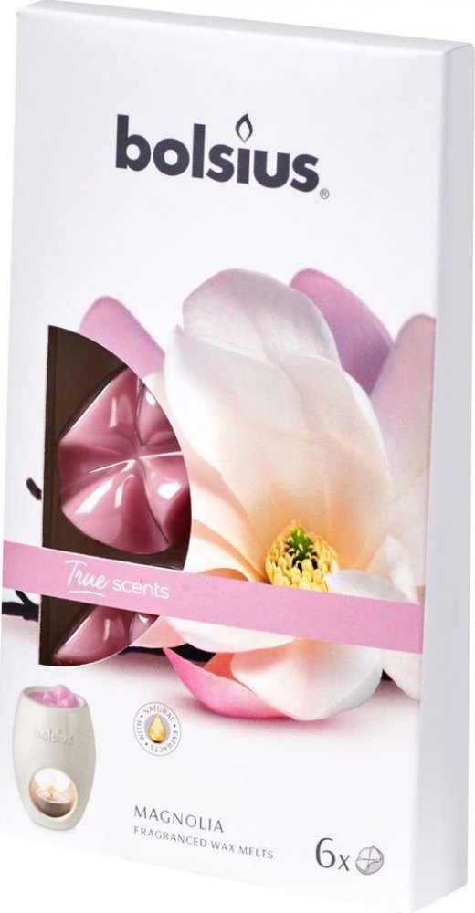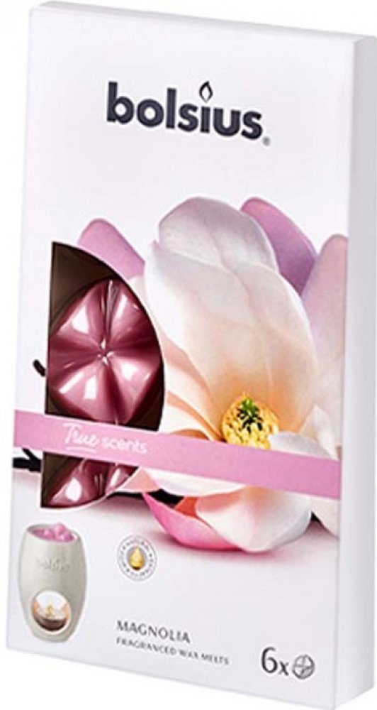 Kvalitní vonný parafínový vosk Bolsius True Scents s vůní kvetoucí magnólie, balení po 6 kusech. Vůně obsahuje pouze přírodní extrakty.  Určeno pro ohřívače vonných vosků nebo aromalamp.
