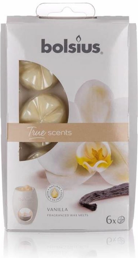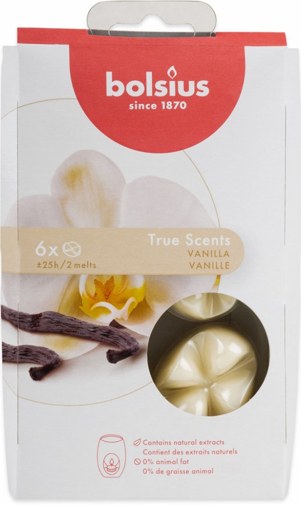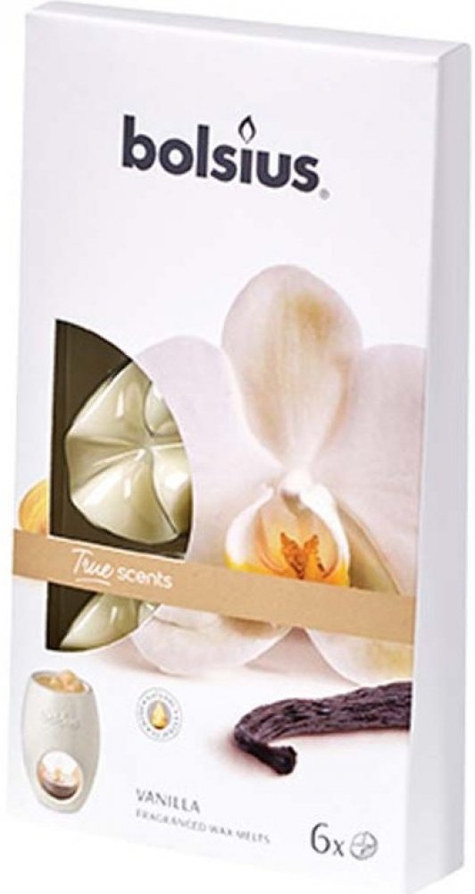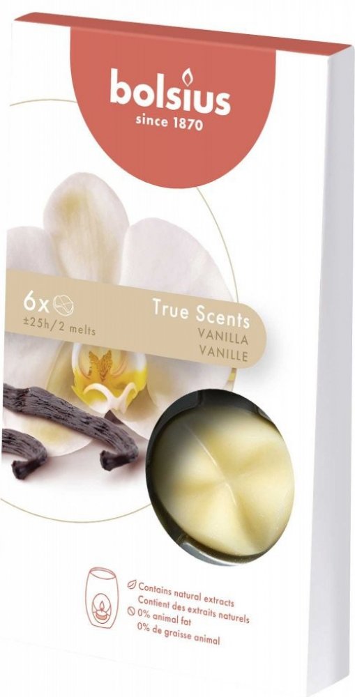 Kvalitní vonný parafínový vosk Bolsius True Scents s intenzivní vůní vanilky, balení po 6 kusech. Vůně obsahuje pouze přírodní extrakty. Určeno pro ohřívače vonných vosků nebo aromalamp.