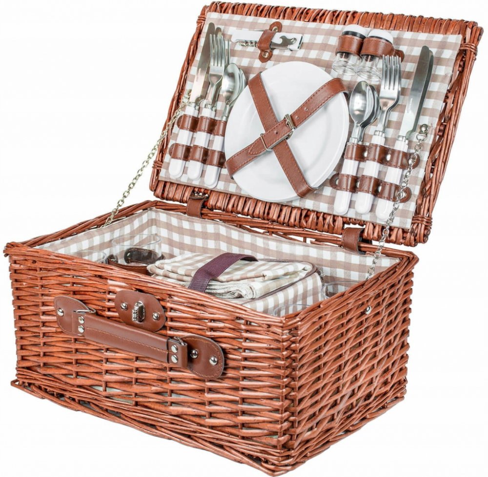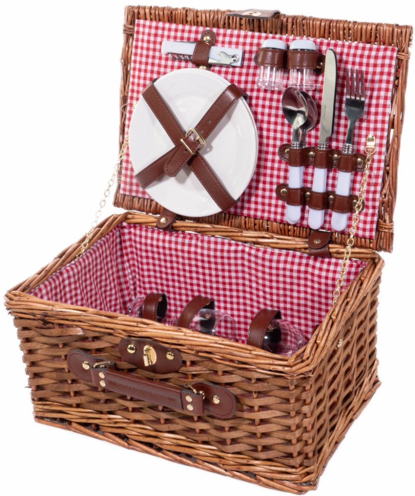 - Úplná sada: Představovaný piknikový koš je kompletní sada pro jednu osobu. V jeho vnitřku najdete talíř, sklenici, lžičku, nůž a vidličku. Příslušenství je přichyceno ke koši, což zabrání jejich posouvání během přepravy. Rozměry koše jsou 38 x 28 x 19 cm.