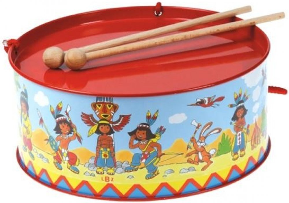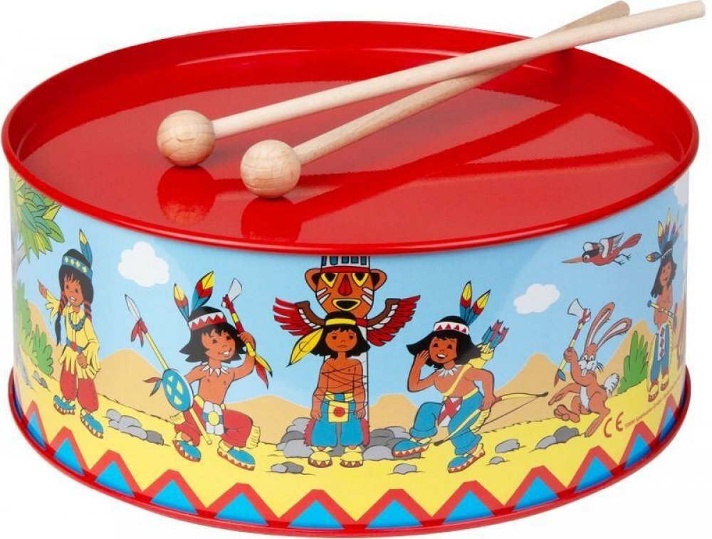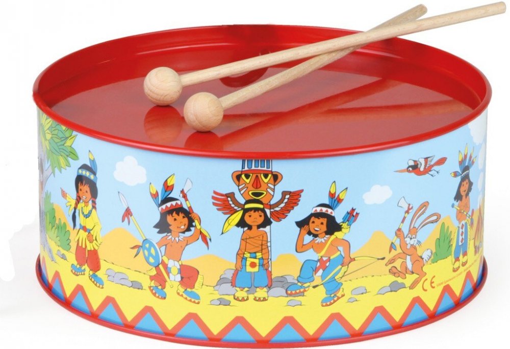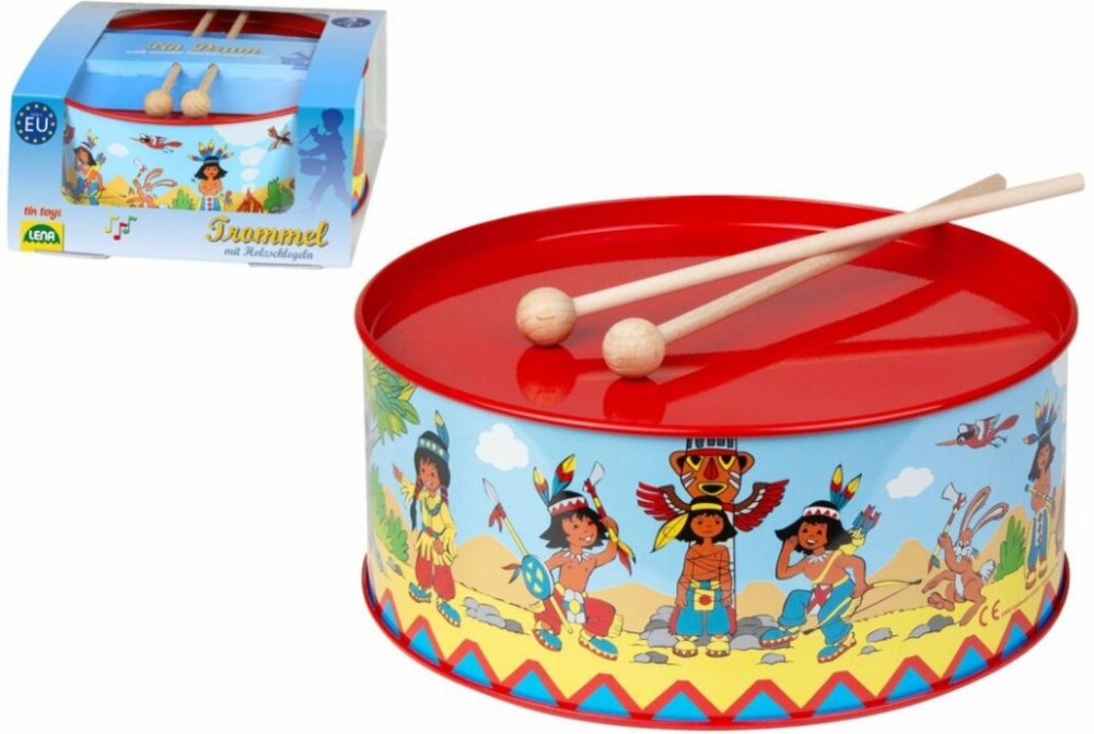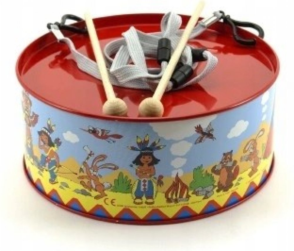 Krásný dětský, červený plechový bubínek z plechu, s pestrým potiskem "indiáni" v setu se dvěma paličkami. Bubínek má provázek na zavěšení přes krk, pro možnost bubnovat i za chůze či pokud se vydáte na pochod.