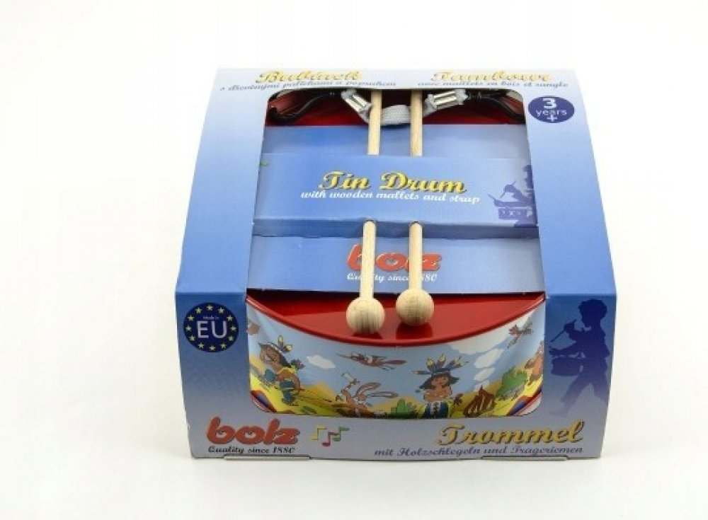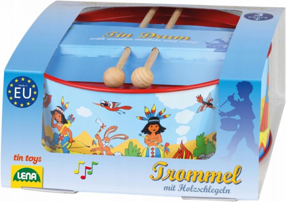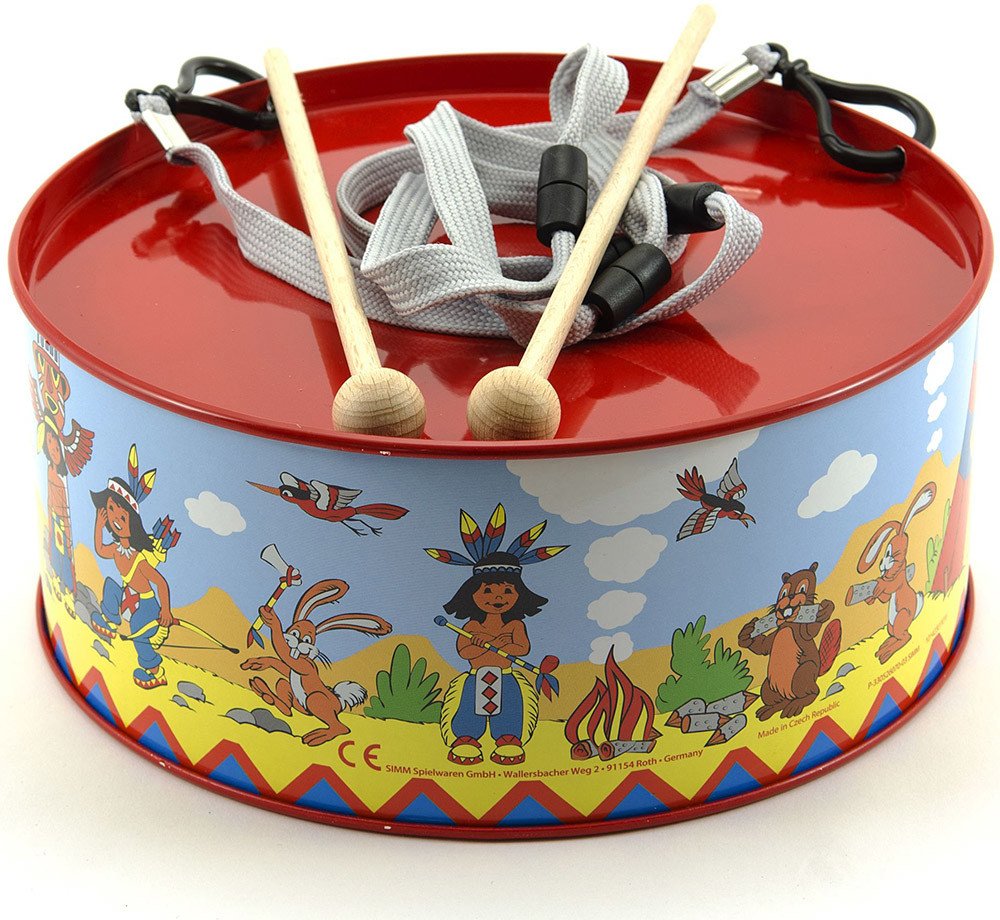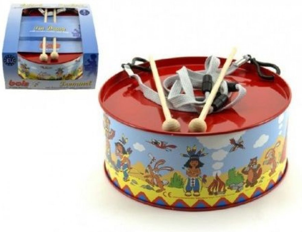 Krásný dětský, červený plechový bubínek z plechu, s pestrým potiskem "indiáni" v setu se dvěma paličkami. Bubínek má provázek na zavěšení přes krk, pro možnost bubnovat i za chůze či pokud se vydáte na pochod.