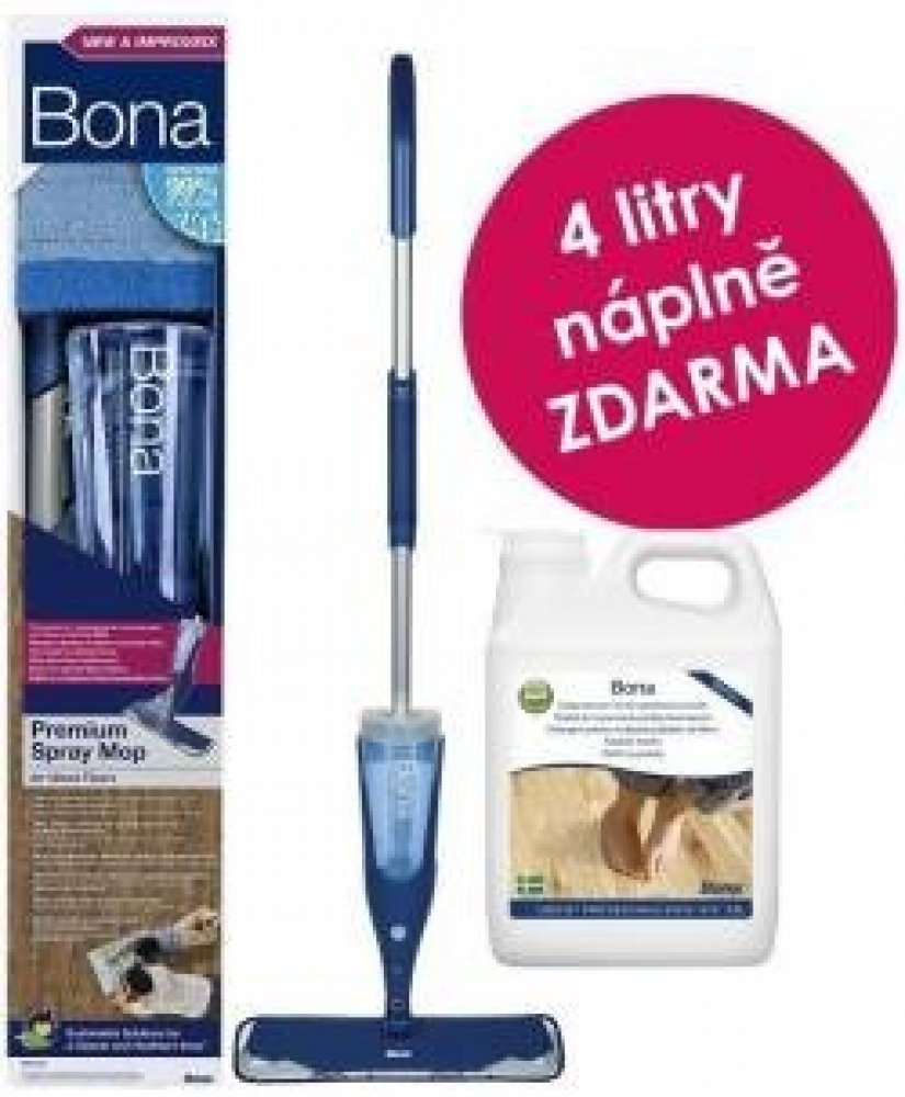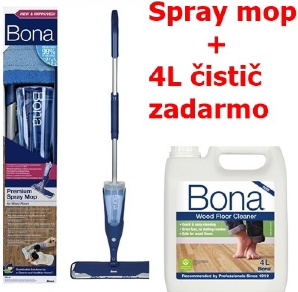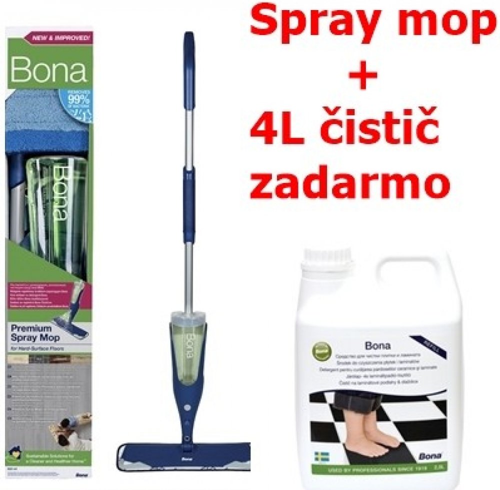 Bona Premium Spray Mop na tvrdé podlahy(laminátové, vinyl, PVC, dlažba) + 4L ČističPredstavujeme nový Bona Premium Spray Mop na drevené a laminátové podlahy.Mop všetko v jednom - mop, naplnený čistiaci prostriedok a utierka.Všetko pre jednoduché čistenie drevených a laminátových podláh.Náplň je možné jednoducho vymeniť za inú, podľa typu povrchu podláh, a tak máte jeden mop, pre jednoduché čisteni...